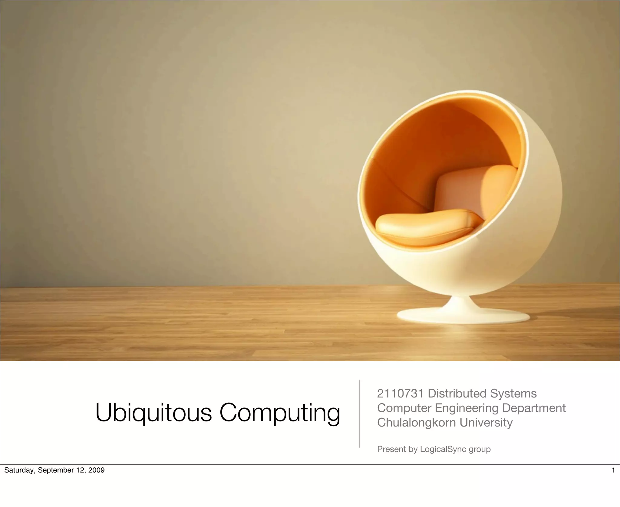 This document presents an introduction to ubiquitous computing. It discusses how ubiquitous computing aims to make many computers available throughout the physical environment, yet make them effectively invisible to the user. It outlines the three waves of computing as mainframes, personal computers, and ubiquitous computing. It also covers key elements of ubiquitous computing including ubiquitous networking, sensing, access, and middleware. Issues with privacy, reliability, and social impact are discussed.