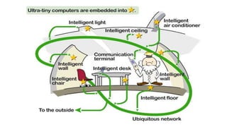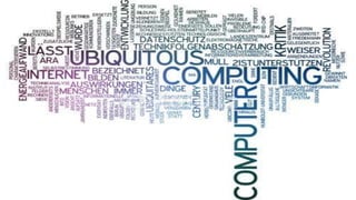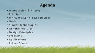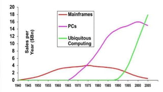 The document discusses the history and principles of ubiquitous computing as envisioned by Mark Weiser in the 1990s. It outlines Weiser's vision of three key devices - the Xerox Pad, Tab, and Liveboard - that represent his goal of seamlessly integrating virtual and physical worlds using invisible computing technologies. The document also notes similar concepts like pervasive computing, calm technology, and ambient intelligence. Potential challenges mentioned include issues with mobility, access control, privacy, and power supplies for ubiquitous computing applications.