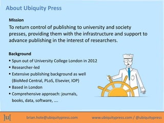 The document discusses the mission of Ubiquity Press, founded by Brian Hole, to empower university and society presses by providing the necessary infrastructure for open data publication. Key features include low-cost data publication, quick peer review processes, and a focus on open access only. The document also highlights the importance of integrating data publication within universities and maintaining a global data journal network.