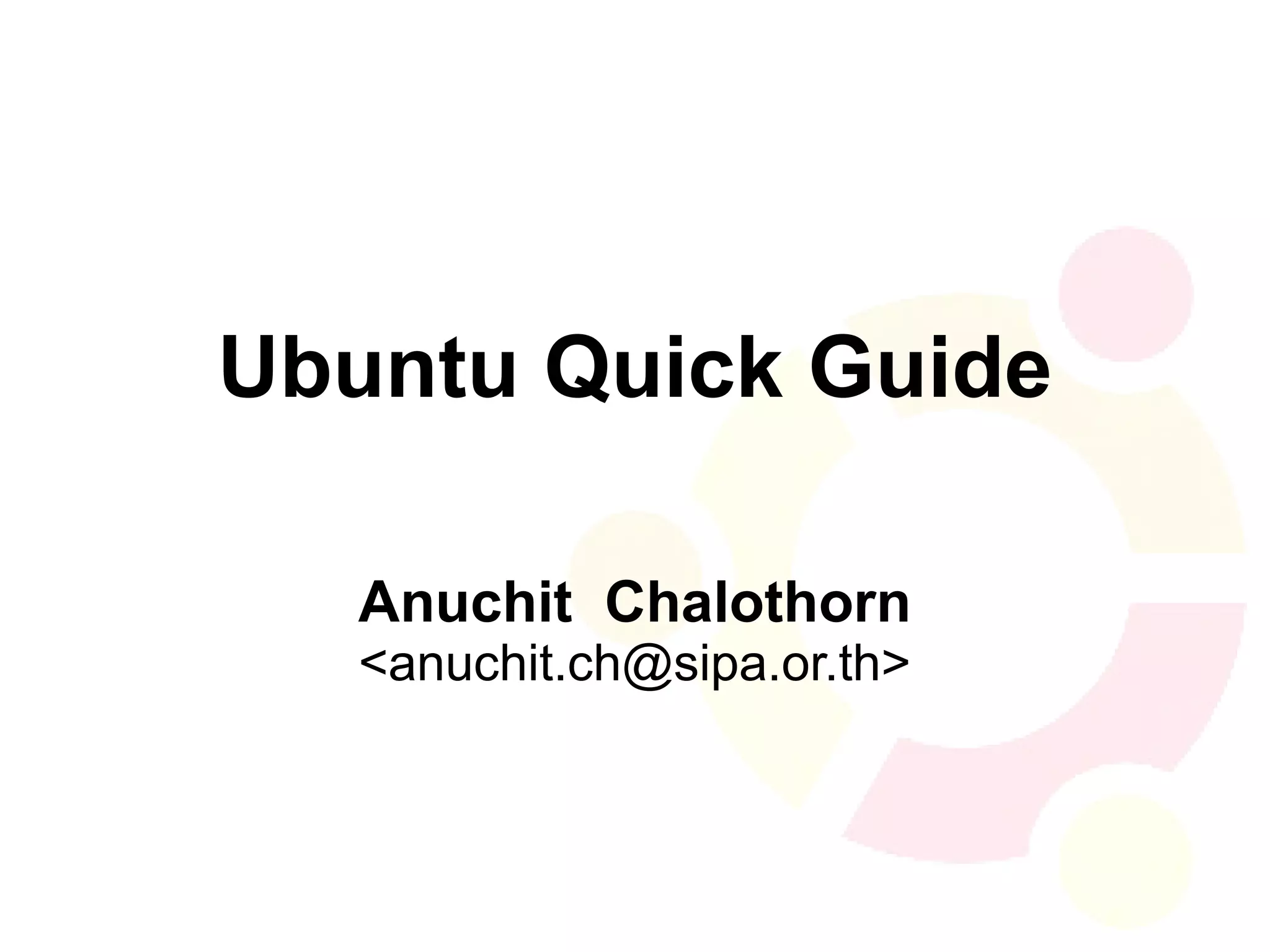 This document provides an overview of Ubuntu, an open-source operating system based on Debian. It discusses Ubuntu's origins with Mark Shuttleworth and Canonical, its focus on usability and a predictable release cycle. Key aspects covered include Ubuntu's package repositories, regular release schedule, official derivatives like Kubuntu and Xubuntu, and ways to obtain support.