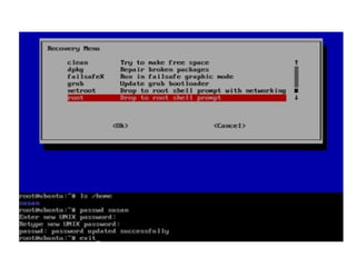 The root user has full administrative access on Linux systems, but Ubuntu uses sudo instead of root for security. Sudo allows users to run commands with root privileges by entering their own password. The first user account created during installation gets sudo access by default. Users can use sudo before commands in the terminal. Sudo remembers passwords for a time to avoid frequent re-entry. The root password can be changed or disabled using sudo passwd. Users without the root password can still access root using sudo -i and entering their own password. The root password can also be reset in recovery mode.