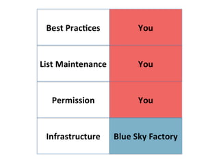 BSF helps email marketers improve deliverability by managing the email delivery contract between the ESP, ISP, and client. They handle the infrastructure so clients don't have to, and focus on permission, list maintenance, and practices that work best for each individual client. The key to deliverability is sending valuable email only to subscribers who want to receive it.