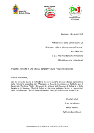 Il documento è una richiesta di convocazione di un'udienza conoscitiva sulla refezione scolastica a Bologna. È indirizzato al presidente della commissione istruzione e cultura e coinvolge vari interlocutori, tra cui l'assessore competente e i promotori di una petizione per l'introduzione di prodotti biologici nelle mense scolastiche. Il firmatario è Francesco Errani, coadiuvato da altri membri del gruppo consiliare.