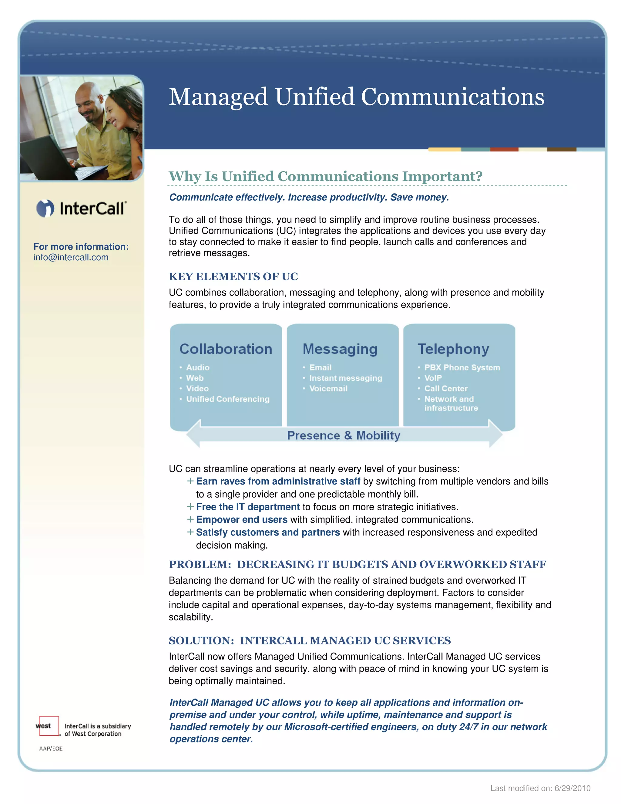Managed Unified Communications (UC) integrates applications and devices to simplify communication and increase productivity while reducing costs. It combines messaging, telephony and collaboration with presence and mobility features. InterCall now offers Managed UC services which deliver cost savings, security and round-the-clock support by Microsoft-certified engineers to ensure the health and stability of a company's UC system.