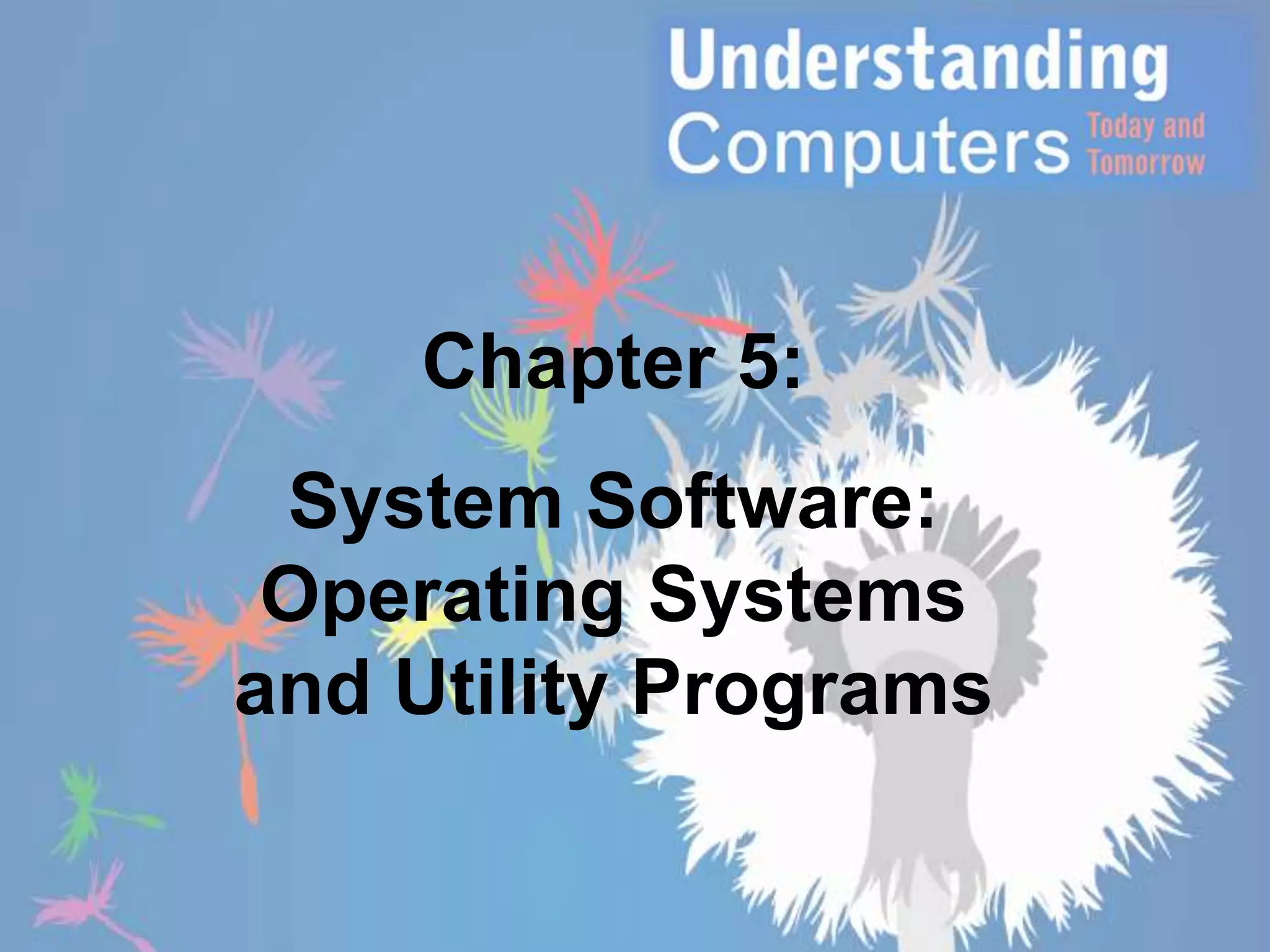 The document discusses system software, including operating systems and utility programs. It describes the functions of operating systems such as interfacing with users, booting computers, managing devices and resources, and providing security. Popular operating systems mentioned include Windows, Mac OS, Linux, Android, and iOS. Utility programs are also discussed, including file management programs, backup and restore utilities, disk management, and search tools.
