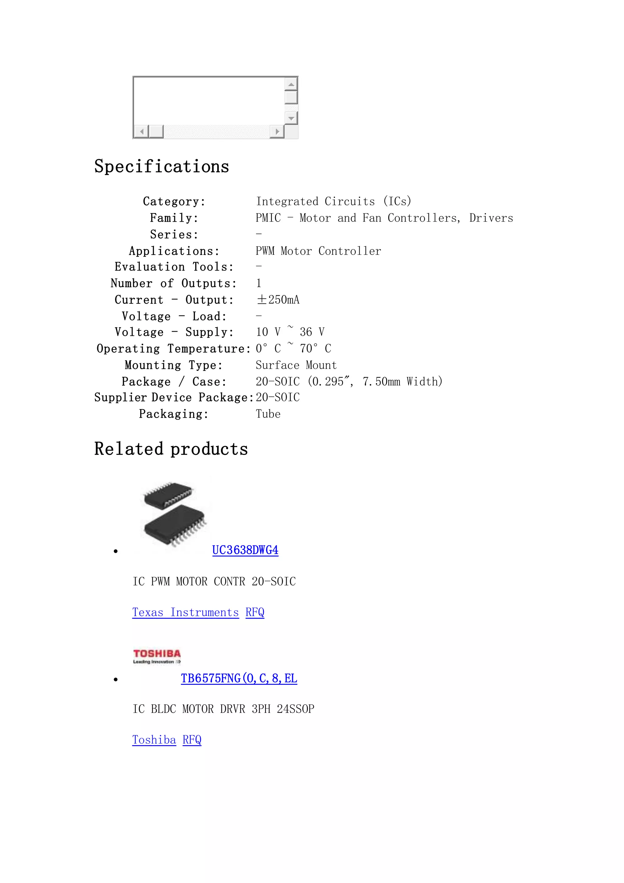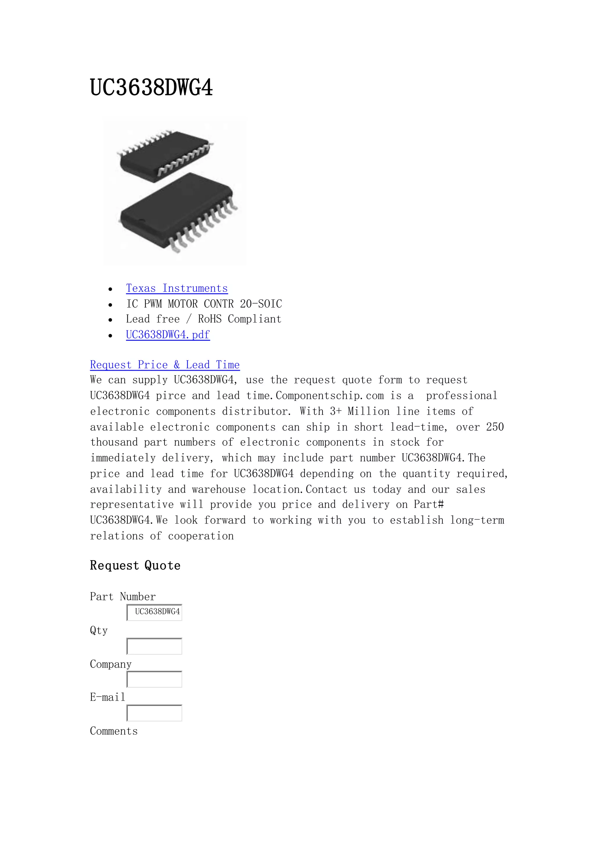 The document provides information about the UC3638DWG4, a PWM motor controller IC from Texas Instruments, including specifications such as supply voltage, output current, and operating temperature. It serves as a sourcing guide for customers looking to request pricing and lead times for the part, emphasizing the distributor's extensive inventory and prompt service. Additionally, related products and a request for quote form are mentioned to facilitate procurement.