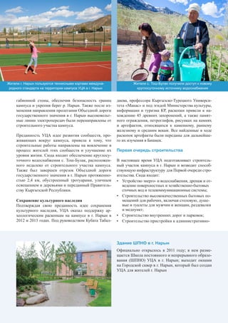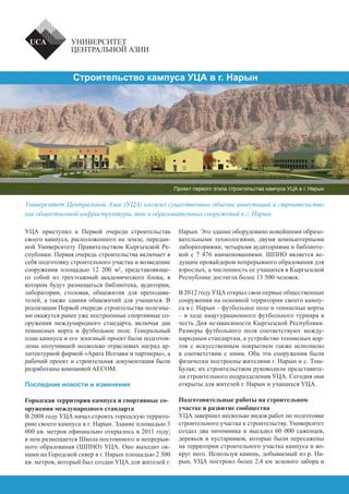 Университет Центральной Азии (УЦА) начал строительство своего кампуса в Нарыне, Кыргызстан, включая трехэтажное здание площадью 12 200 м2, которое будет включать библиотеку, аудитории и общежития для студентов и преподавателей. В УЦА также осуществляется создание общественной инфраструктуры и благоустройство территории, включая спортсооружения и посадку деревьев. Запланировано, что кампус будет вмещать 1 200 студентов и откроет свои двери для первых учащихся в сентябре 2016 года.