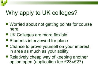 This document provides information about applying to colleges in the UK through UCAS (Universities and Colleges Admissions Service). It outlines the application process and deadlines, the types of courses available, and tips for completing different sections of the application like the personal statement. Key details include a range of over 5,000 undergraduate courses being offered, the application fee of £23, and deadlines of October 15th for most selective courses or January 15th for others. The personal statement and admissions tests are emphasized as important parts of the competitive application.