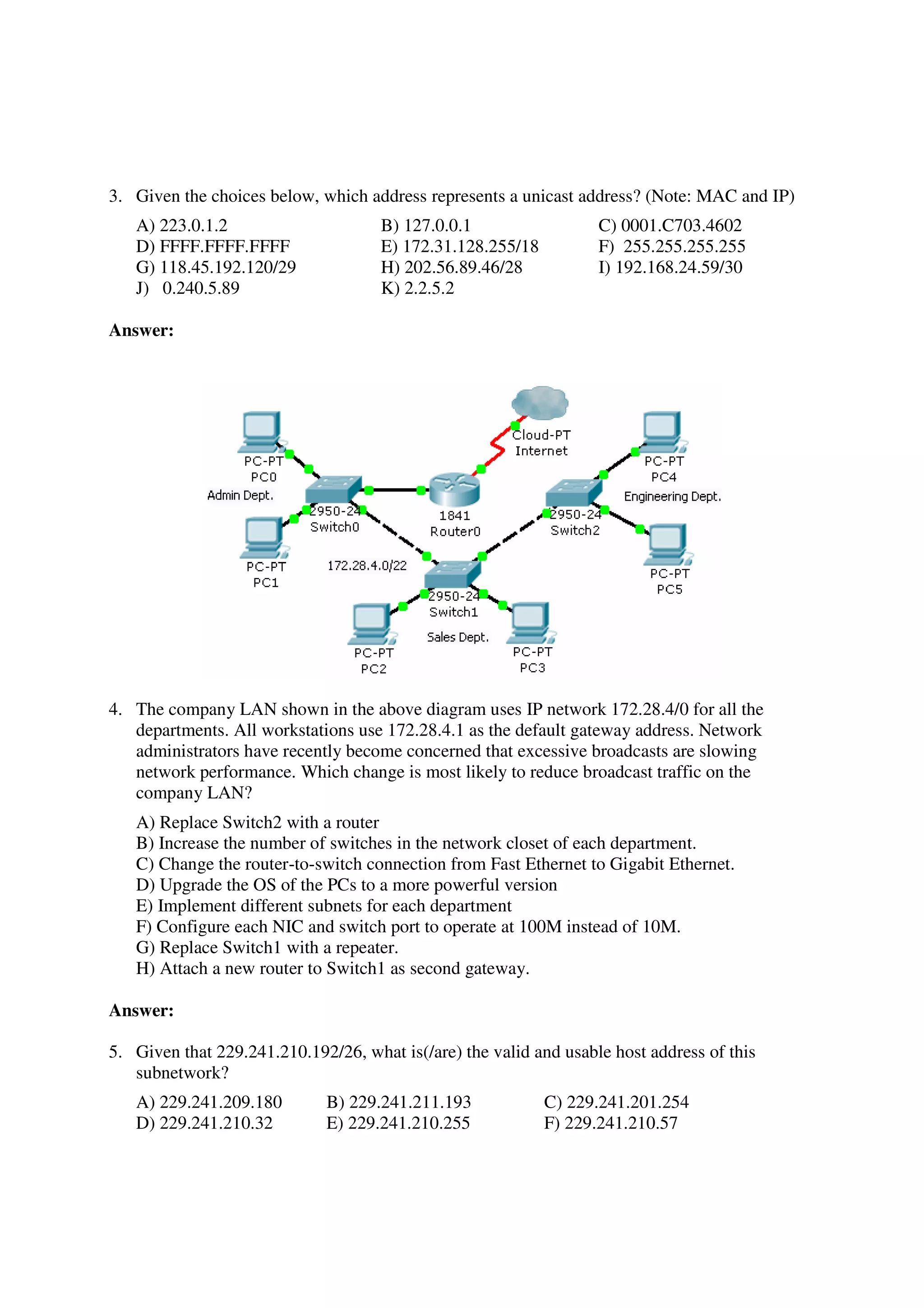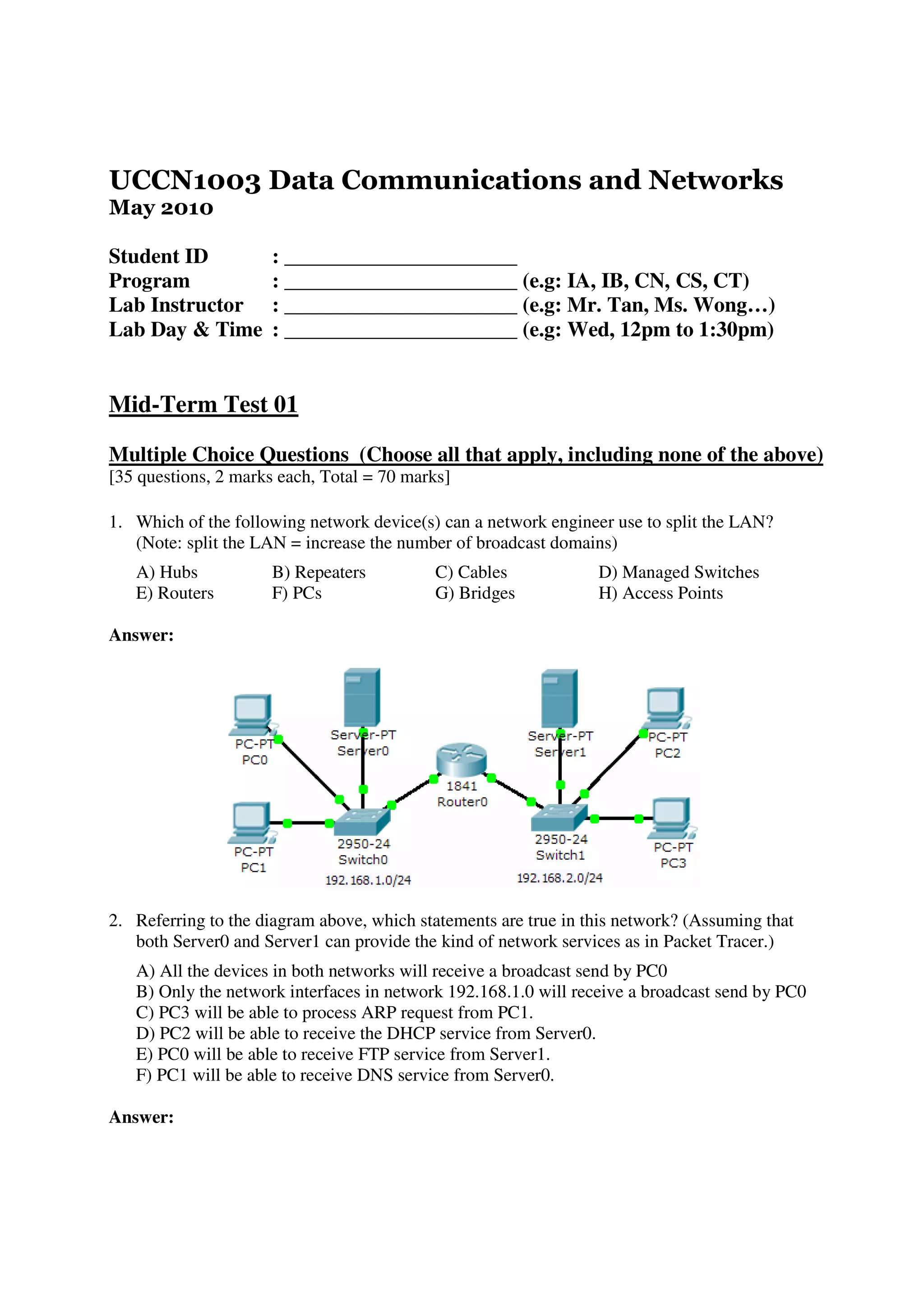 This document provides a 35 question multiple choice test on data communications and networks. The questions cover topics such as network devices, IP addressing, routing, switching, and TCP/IP protocols. The test is for the UCCN1003 Data Communications and Networks course in May 2010. It requests the student provide their ID, program of study, lab instructor, and lab time before beginning the multiple choice questions.