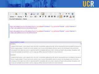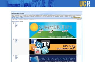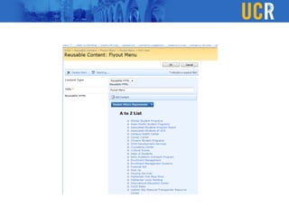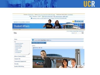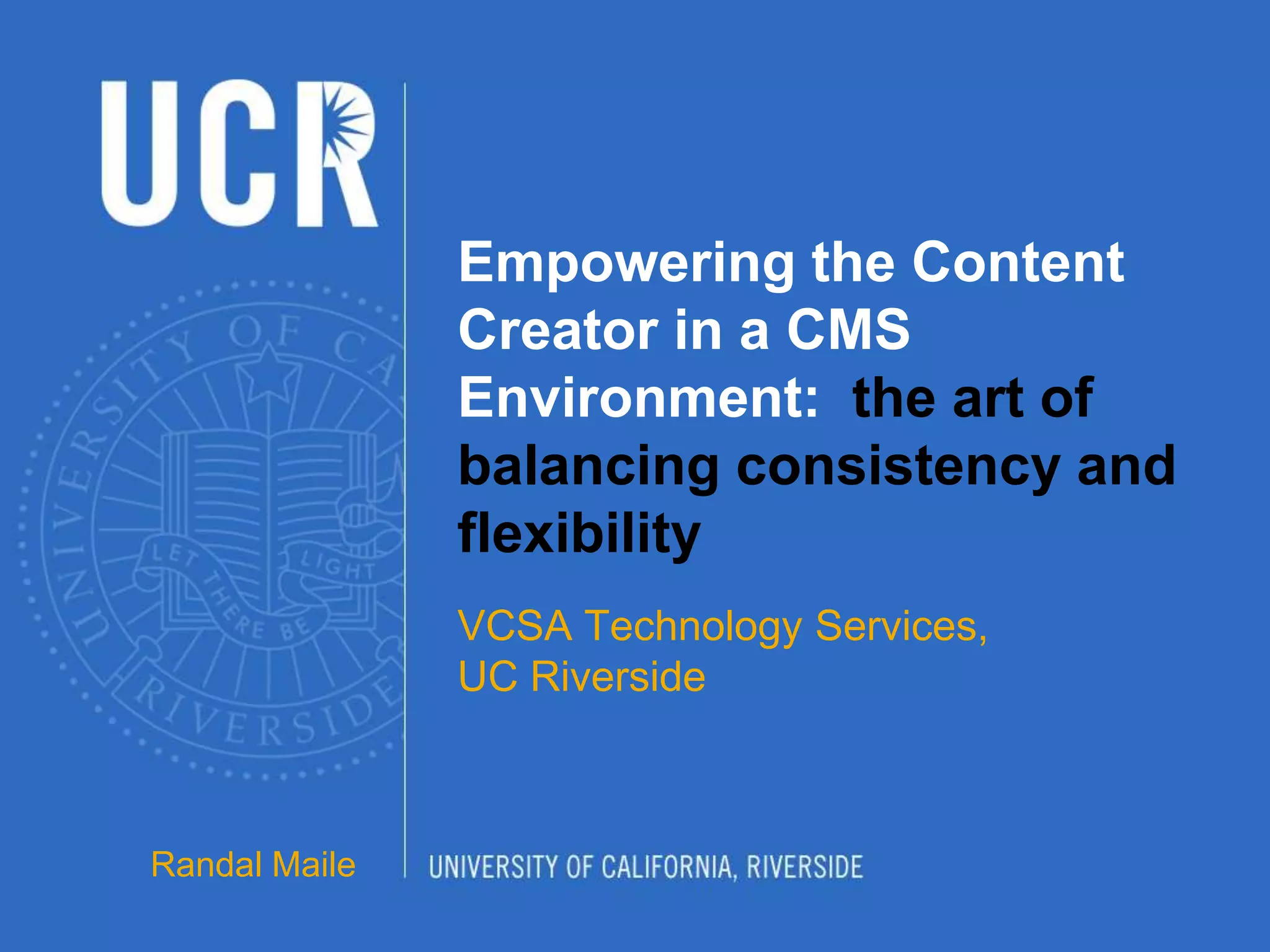 The document outlines a custom CMS solution for the Vice Chancellor for Student Affairs (VCSA) at UC Riverside, emphasizing the need to balance consistency with flexibility in web design and content management. It details design elements such as unique masthead images, color schemes, and various page layouts, along with implementing a WYSIWYG editor and integrating interactive elements using jQuery. The goal is to create user-friendly tools for content creators, making it easier for departments to manage their unique branding while adhering to established guidelines.