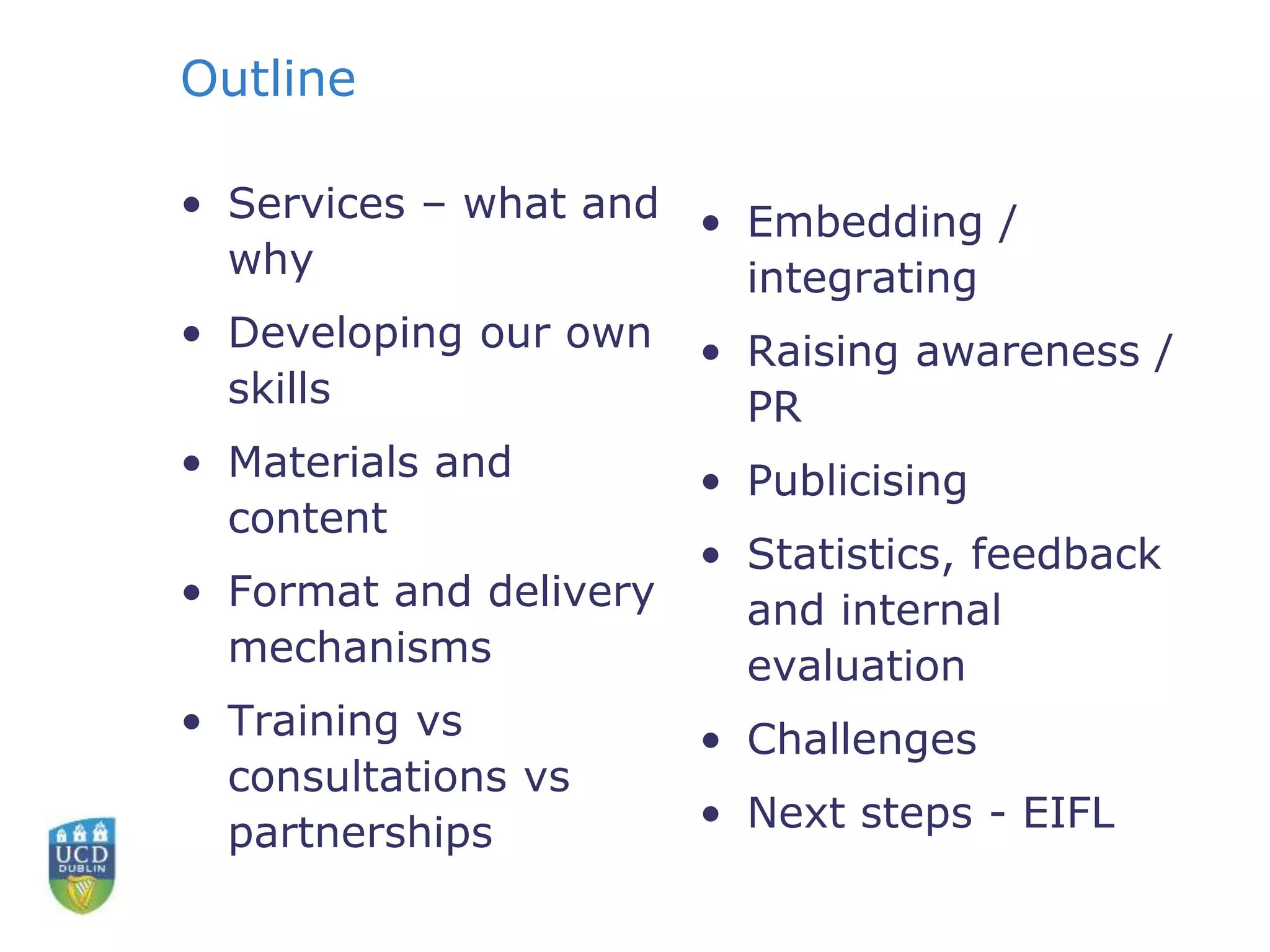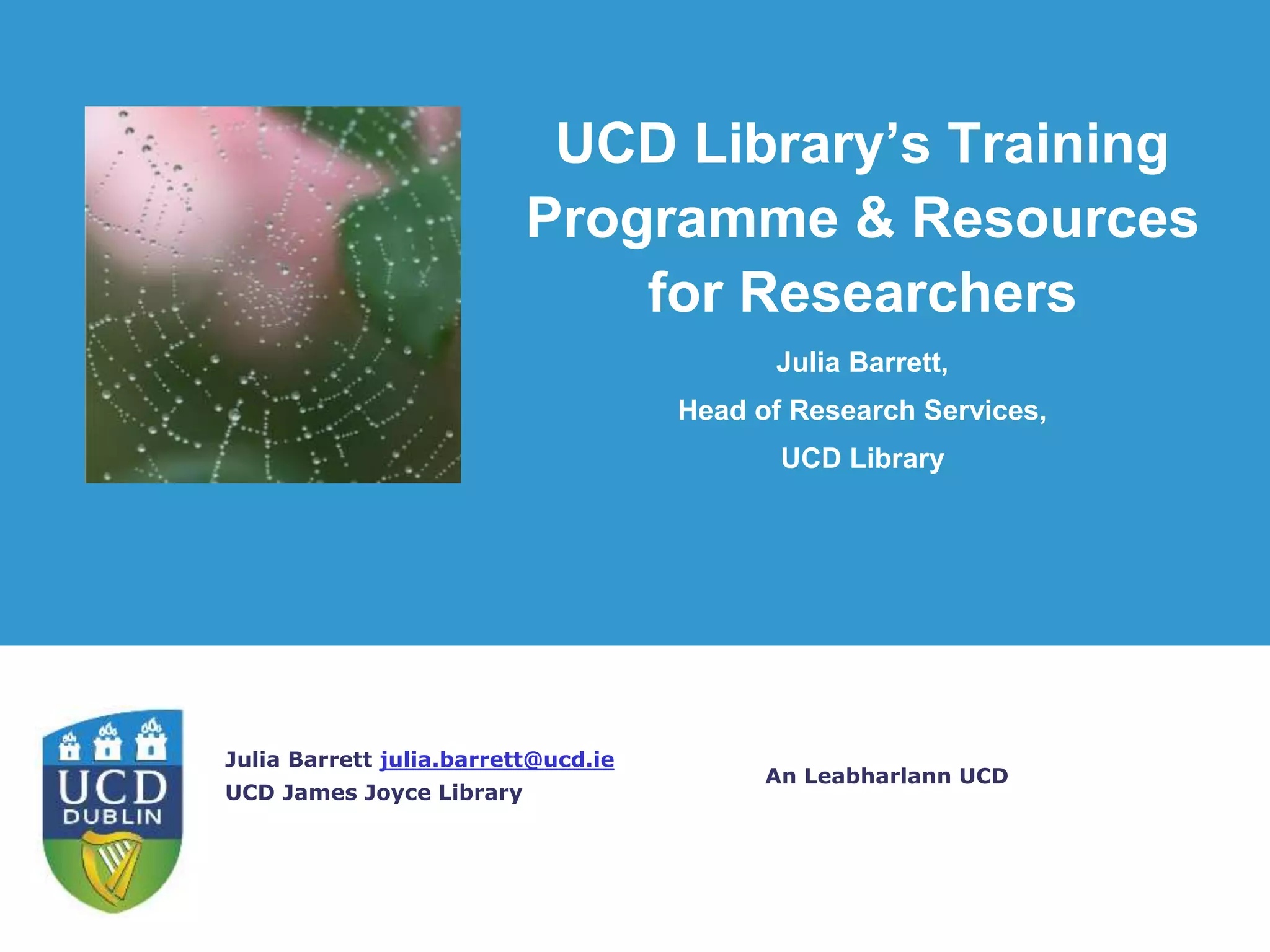 The document outlines the University College Dublin (UCD) Library's training program and resources aimed at enhancing research services for faculty and students. It discusses services offered, challenges faced, and strategic objectives related to improving research quality and impact, including training methodologies and partnership development. Additionally, it emphasizes the importance of collaborative efforts and feedback mechanisms for continuous improvement in research support services.