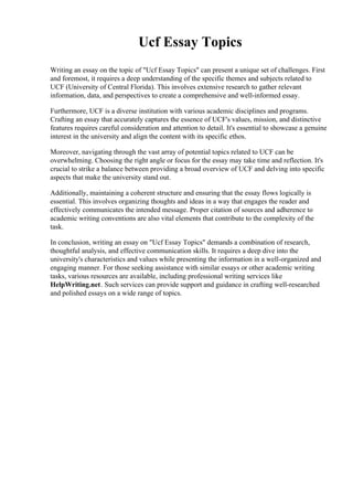 Writing an essay about topics related to the University of Central Florida (UCF) requires extensive research to understand UCF's diverse programs and values. It is important to choose an angle that both provides an overview of UCF and highlights specific aspects that make it unique. The essay must be logically organized and flow coherently while properly citing sources and following academic conventions. In conclusion, crafting a high-quality essay on UCF topics demands in-depth analysis of the university and clear communication of the information.