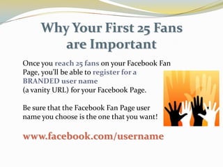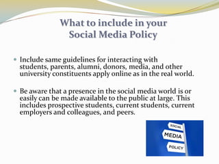 This document provides an overview of social media and tips for using platforms like Facebook and LinkedIn for business purposes. It discusses how to create Facebook fan pages and LinkedIn profiles, engage communities on these sites, and develop social media marketing strategies and policies. The key takeaways are how social networking allows businesses to connect with customers, build their brand, and participate in online conversations. Guidelines are also presented for appropriate social media use and content by employees representing their organizations.