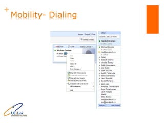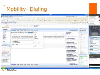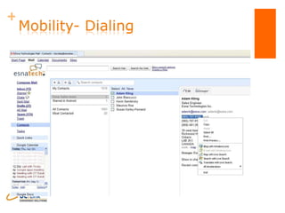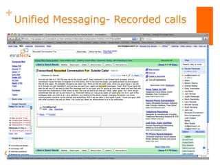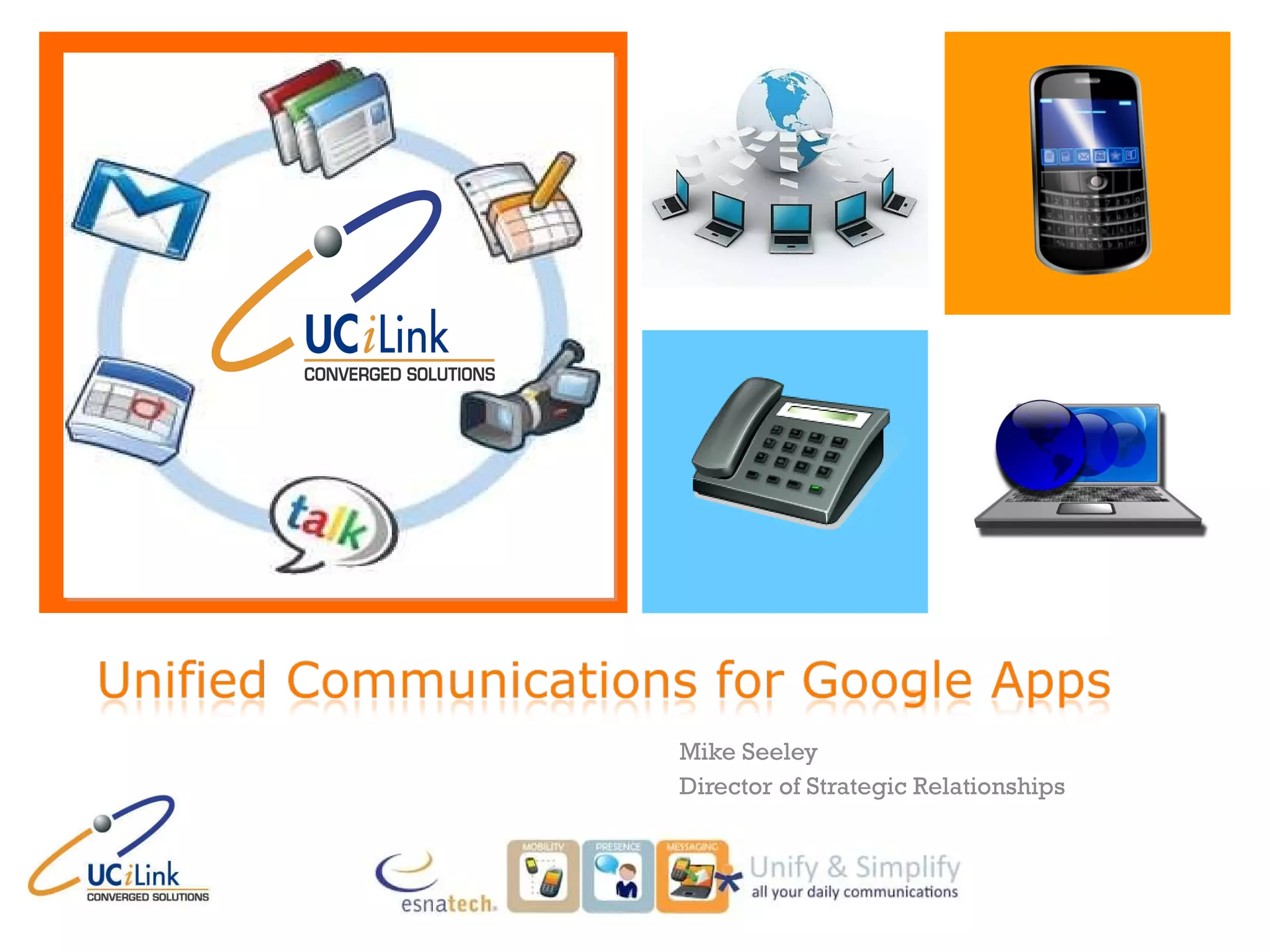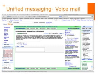 The document summarizes a unified communications solution that integrates with Google Apps and is hosted by Google. It allows adding mobility, presence, and unified messaging to the Google Apps environment. The solution bridges the enterprise infrastructure to Google applications and software as a service, providing access to voice mail, faxes, calendar, and contacts from within Google email and across devices. It is available at a fraction of the cost and management requirements of traditional on-premise unified communications solutions.