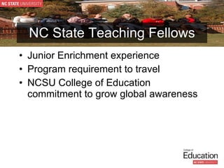 The document summarizes a program that took education majors from North Carolina State University's College of Education on cultural immersion trips to Costa Rica in 2008 and 2010. The trips involved visits to locations important to Costa Rica's economic, educational, and social culture, as well as recreational activities. Students gained cultural experience outside of North Carolina and the US, along with increased self-awareness, confidence, and understanding of diversity that will help them create inclusive classrooms. The program director discusses challenges and plans to expand the program in the future.