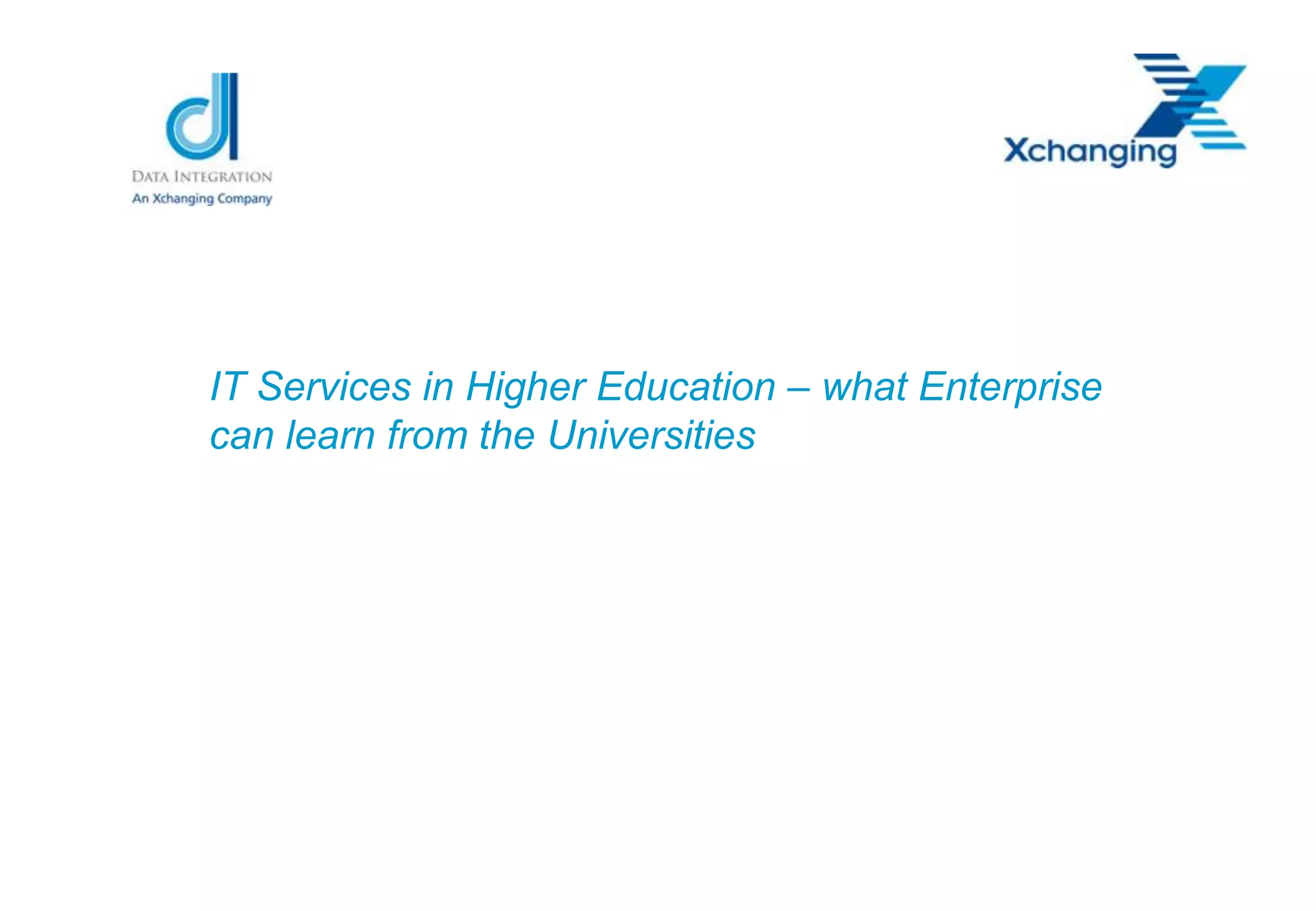 This document discusses how higher education institutions have led the way in addressing emerging IT issues like BYOD, cloud computing, big data, and mobility with limited budgets. It provides examples of how universities have supported a wide variety of student-owned devices and driven innovation through large research projects involving collaboration and data sharing. The document suggests enterprises can learn lessons from higher education's experiences in areas like policy, productivity focus, multi-tenancy infrastructure sharing, and driving technology innovation through ambitious projects.