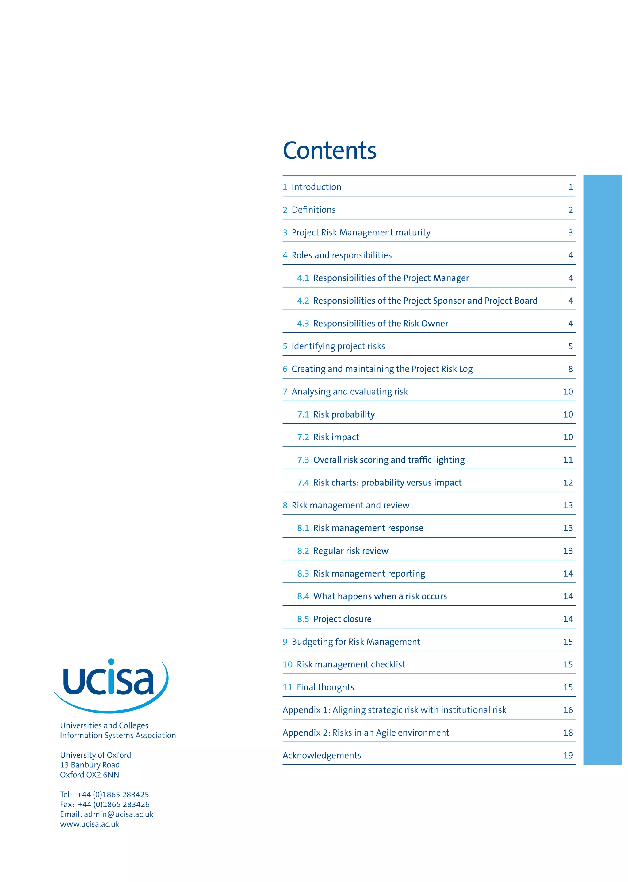 The document provides a comprehensive guide on effective risk management for IT and business change projects within universities and colleges. It outlines the definitions of project risks, roles and responsibilities in risk management, and the importance of identifying and evaluating risks to enhance project success. Developed by UCISA, the guidance emphasizes the necessity of a mature and proactive approach to project risk management to optimize outcomes and minimize threats.