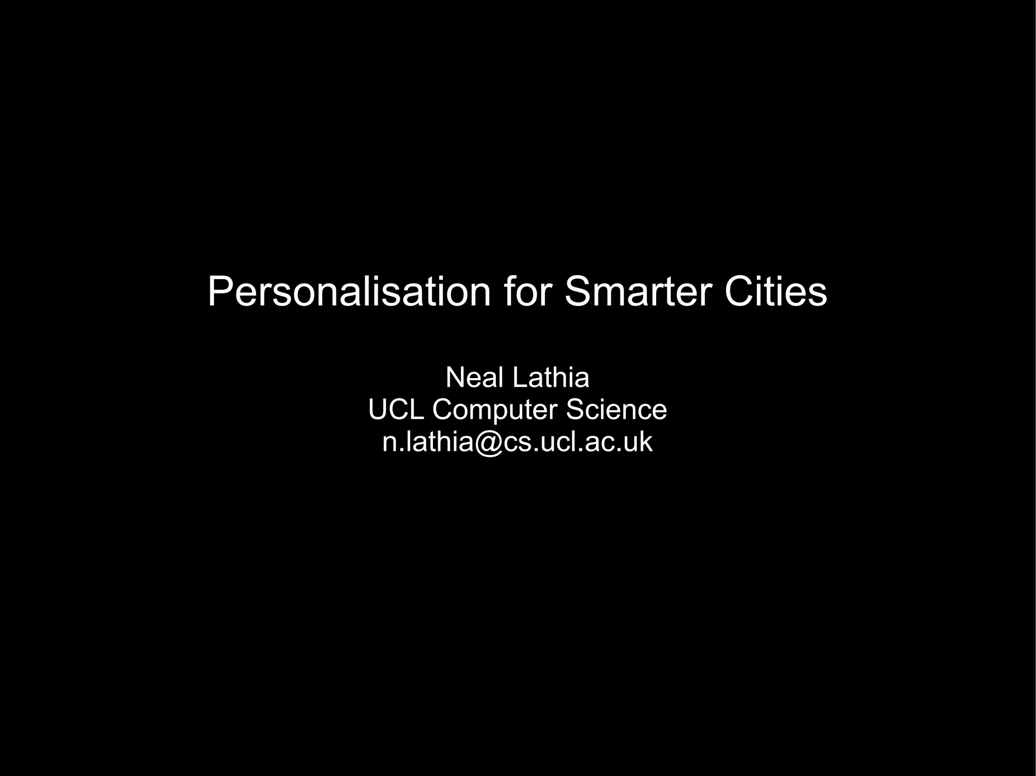 This document discusses how data mining techniques used by web companies could help solve problems in cities. It provides examples of using travel data from Oyster cards and mobile phones to perform clustering, regression, ranking, and classification. Clustering can group travelers by behavior, regression can predict travel times, ranking can order station alerts by relevance, and classification can recommend the cheapest tickets based on travel habits. The goal is to personalize services for smarter, more efficient cities.