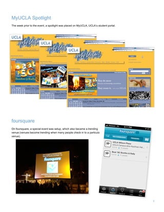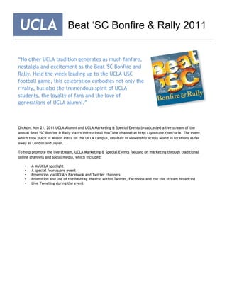 The Beat 'SC Bonfire and Rally is a significant UCLA tradition held before the UCLA-USC football game, celebrating school spirit and community. In 2011, the event was live-streamed, attracting viewers globally and promoting engagement through various social media channels. Positive feedback from the audience highlighted the event's success and the social media strategy employed to enhance viewer interaction.