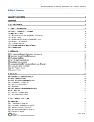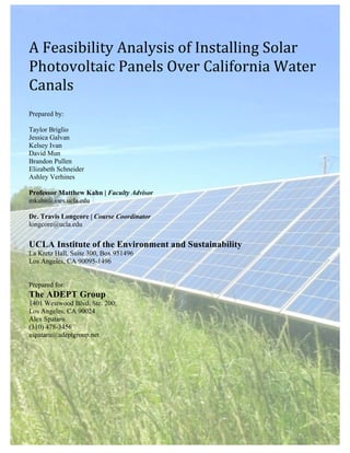 This document analyzes the feasibility of installing solar panels over California water canals. It finds that such a project could provide significant benefits by reducing evaporative water loss, saving on pumping costs, and generating renewable energy. A suitability analysis identified optimal locations. Economic analyses found positive net present values and competitive levelized costs of energy. The project would also create jobs and reduce greenhouse gas emissions. Challenges include high upfront costs and permitting uncertainties. Financing options and an implementation plan are proposed to address these challenges.
