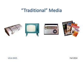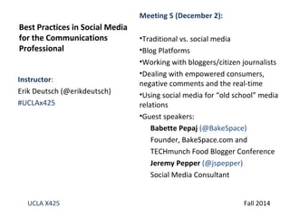 This document summarizes key topics from Meeting 5 of the UCLA X425 communications class, including traditional vs social media, blog platforms, working with bloggers, dealing with consumers in social media, and using social media for PR. The meeting featured guest speakers Jeremy Pepper, a social media consultant, and Babette Pepaj, founder of BakeSpace.com and producer of the TECHmunch Food Blogger Conference, to discuss best practices in social media for communications professionals.