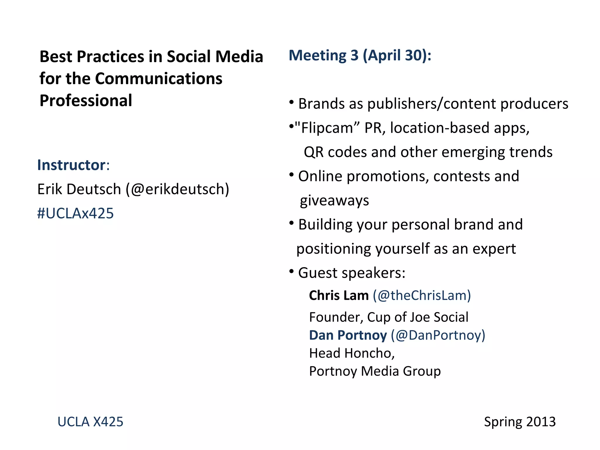 This document summarizes a class on best practices in social media for communications professionals. It discusses emerging trends like location-based apps and QR codes. It outlines the components of a social media strategy, including situation analysis, goals, target audiences and competitive analysis. The class covered distinguishing strategies from tactics and providing examples. Guest speakers were scheduled to discuss building a personal brand and positioning yourself as an expert.