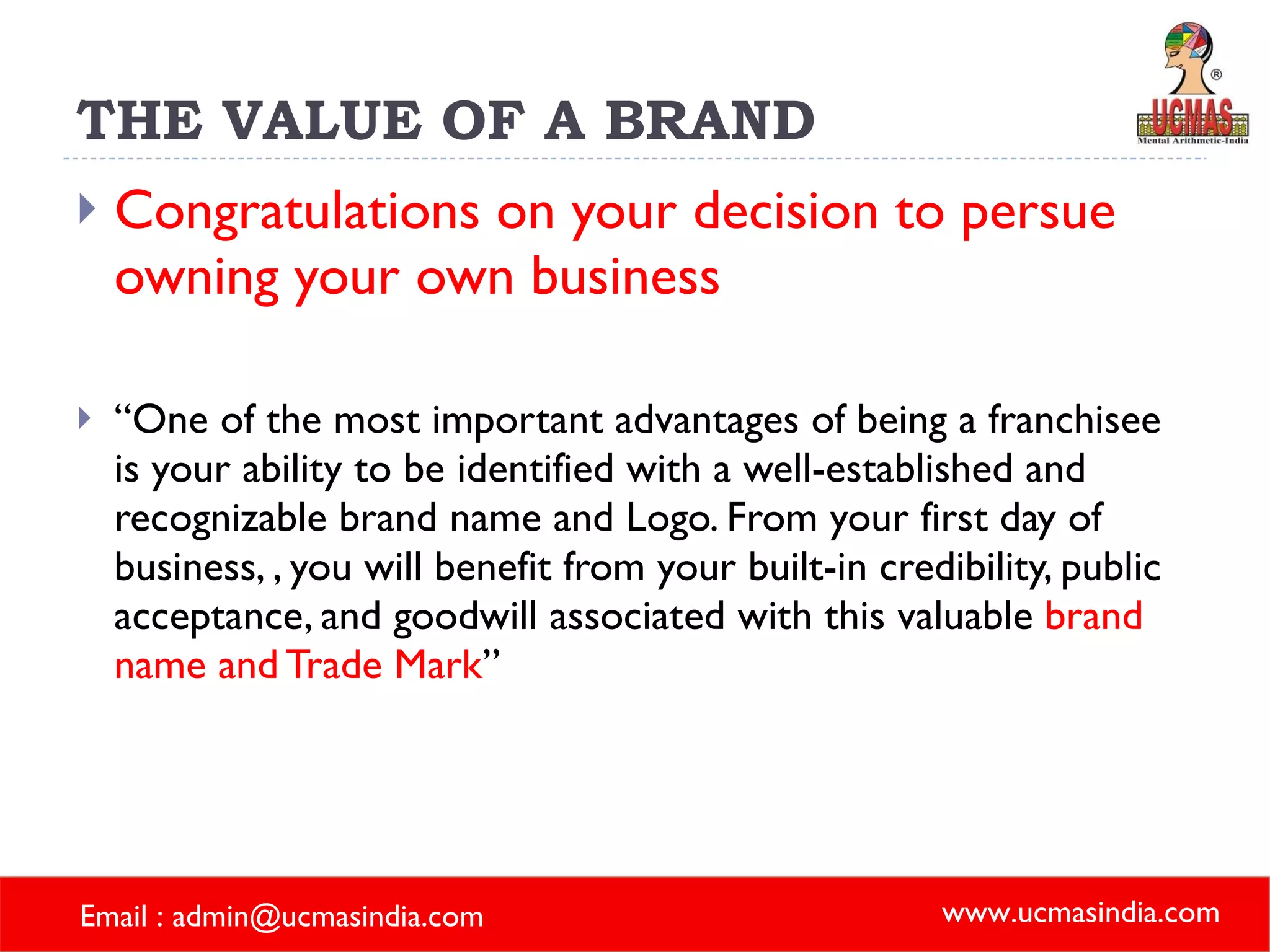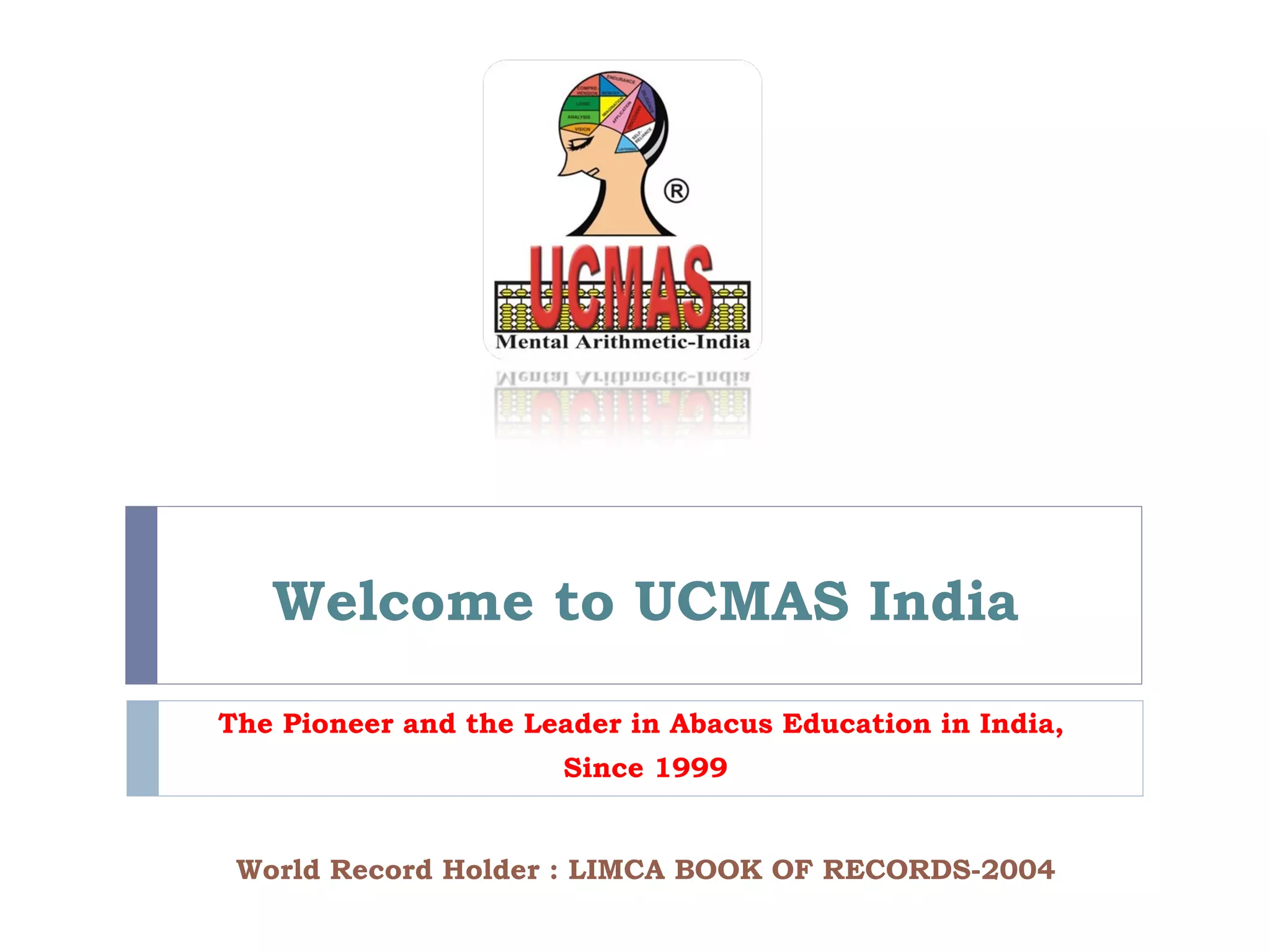 UCMAS is an international organization that provides abacus and mental arithmetic training to children ages 4-12 in India and around the world. It aims to develop children's intellect through improved concentration, imagination, memory, and reasoning skills. The program uses an ancient Chinese tool called an abacus to represent numbers visually and perform calculations, which stimulates both the left and right brains to promote whole brain development. UCMAS has over 4,000 franchise centers across India and other countries that have trained over 400,000 children since 1999.