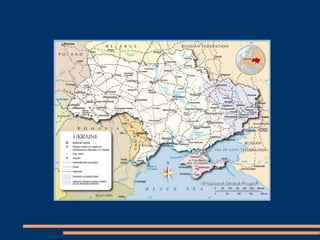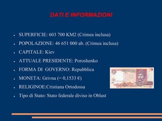 L'Ucraina, con una superficie di 603.700 km² e una popolazione di circa 46,7 milioni, è una repubblica federale con capitale Kiev e attuale presidente Petro Poroshenko. La sua economia è caratterizzata da un settore primario agricolo sviluppato e un secondario in difficoltà, con problematiche legate alla transizione da fattorie collettive a industrie. Il paese ha una storia complessa di conflitto culturale e politico, culminata nella recente crisi che ha portato alla perdita della Crimea e a significative tensioni con la Russia.