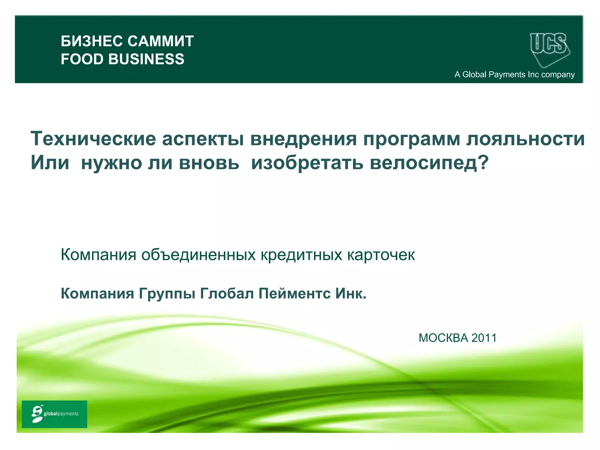 Документ описывает возможности компании A Global Payments Inc в области внедрения программ лояльности для розничной торговли, акцентируя внимание на уже существующих технологических решениях. Программа лояльности может способствовать удержанию клиентов и увеличению финансовых результатов бизнеса. Компания предоставляет широкий спектр услуг, включая эквайринг и процессинг транзакций, с акцентом на внедрение технологий, которые позволят бизнесам оптимизировать свои операции.