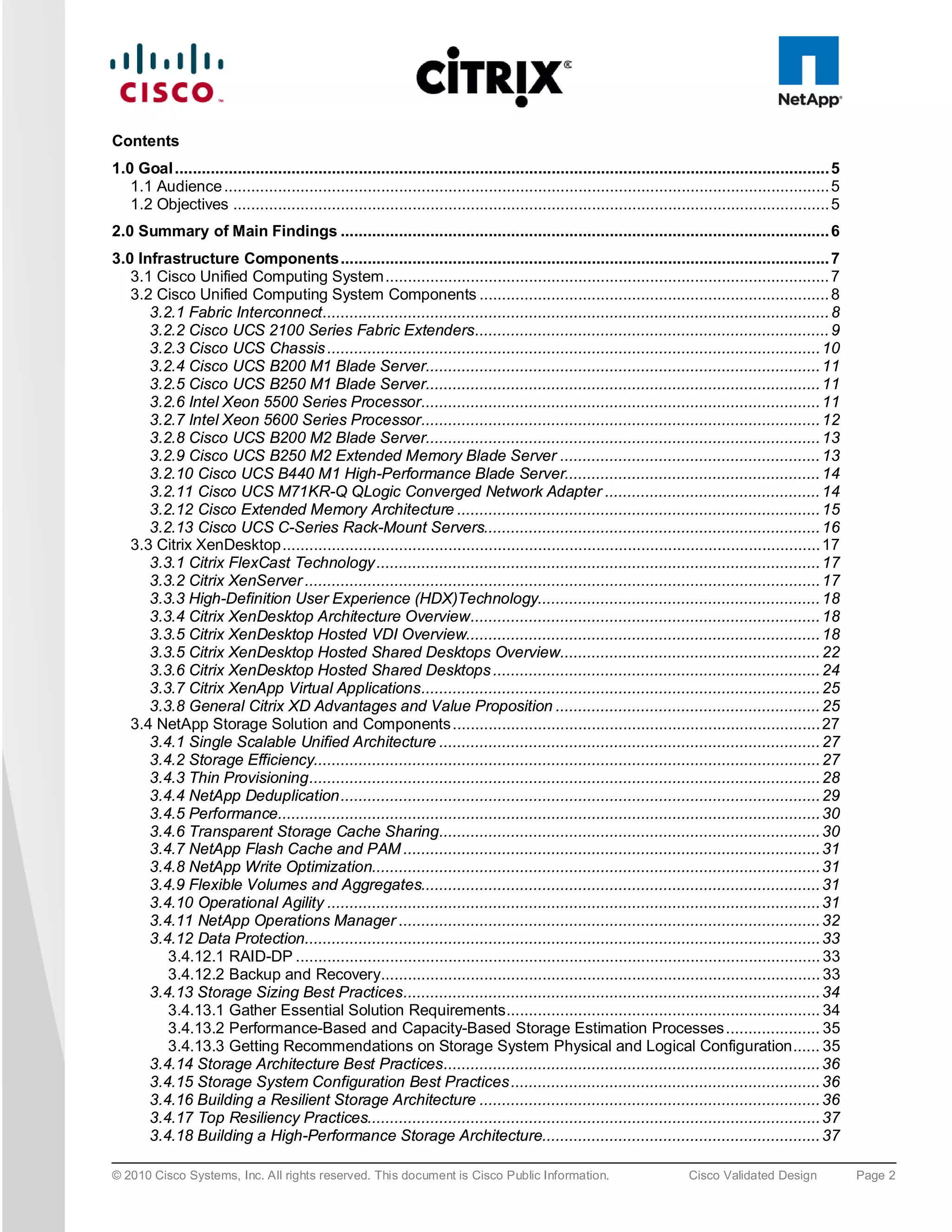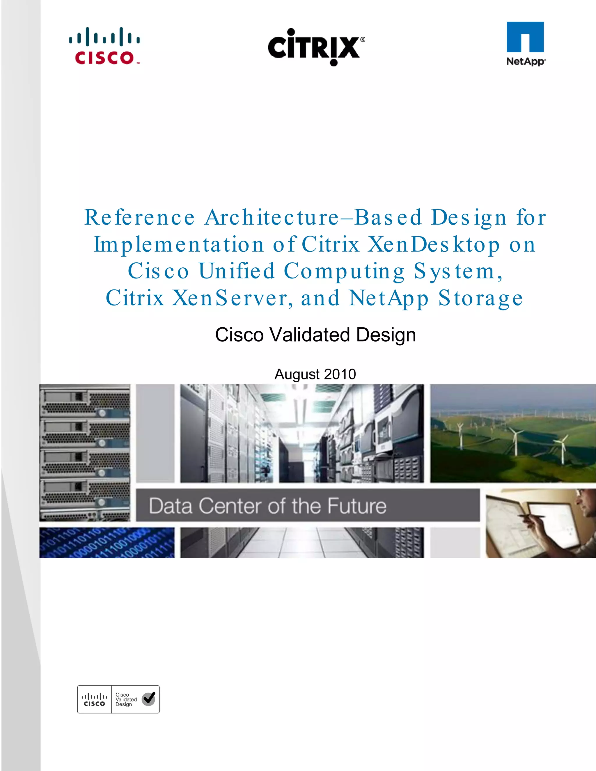 The document evaluates the scalability of Citrix XenDesktop on Cisco UCS B-series blade servers connected to NetApp storage, providing best practice recommendations for large-scale deployments. It reports successful validation of hosted VDI and shared desktops, highlighting effective memory configurations that enable high-density desktop sessions with linear scalability observed between different server configurations. Additionally, it emphasizes the advantages of Cisco's unified computing system in terms of performance, management, and infrastructure simplicity.