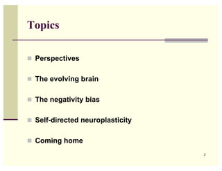 This document summarizes a talk on managing the caveman/cavewoman brain in the 21st century. It discusses perspectives on bringing together neuroscience, psychology and contemplative practice. It then covers topics like the evolving brain, the negativity bias, self-directed neuroplasticity, and coming home to the brain's natural responsive mode. It emphasizes how mindfulness can be used to shape the brain through attention and experience positive emotions and internalize resources in implicit memory. The talk provides strategies for taking in the good and using psychological antidotes to reactive tendencies.