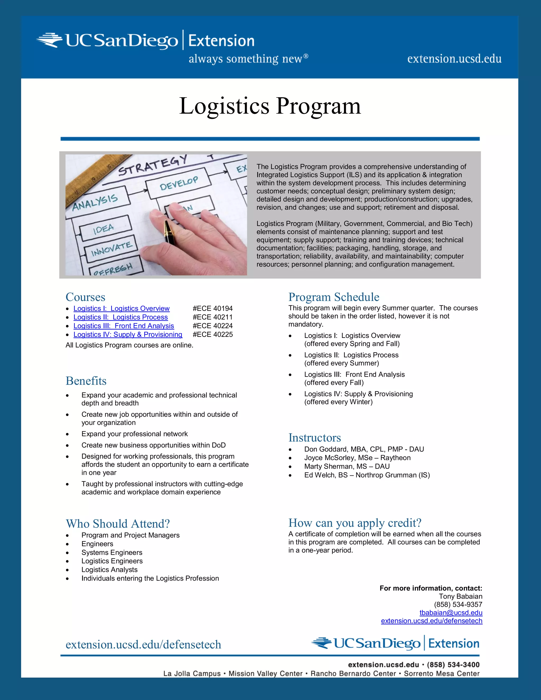 The Logistics Program provides a comprehensive overview of integrated logistics support and its application within the system development process. It consists of courses that cover logistics overview, processes, front-end analysis, and supply/provisioning. The program is designed for working professionals and can be completed in one year through online courses taught by instructors with academic and industry experience.