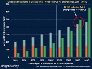The document discusses the growth and impact of mobile computing, noting that in 2012, 50% of the U.S. population is projected to own smartphones. It highlights that mobile data usage is expected to increase significantly, with 90% of the global population projected to have mobile coverage by 2015. Additionally, it mentions the importance of adapting strategies in mobile internet access among younger demographics.