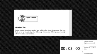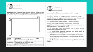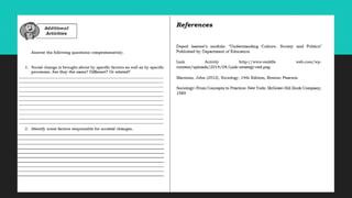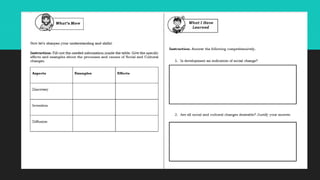 The document discusses concepts related to culture and society, including major elements of culture such as symbols, language, norms, values, and artifacts. It also discusses cultural groups like communities, ethnic groups, and societies. Key social processes that can drive change are identified as discovery, invention, and diffusion. Finally, the document outlines different types of societies including hunting, horticultural, agrarian, industrial, and post-industrial.