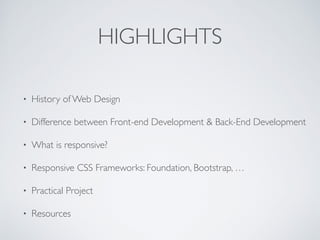 This document provides an overview of how to create a website template within one hour. It briefly covers the history of web design from the first webpage in 1992 to modern sites like Google and Apple. It distinguishes between front-end development using HTML, CSS and JavaScript and back-end development using languages like PHP, Python and C#. It also introduces responsive design frameworks like Bootstrap that allow sites to adapt to different screen sizes. The document concludes by providing resources for learning Bootstrap and coding a practical responsive project within an hour.