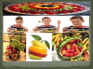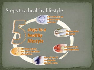 This document discusses various aspects of maintaining a healthy lifestyle, including physical activity, nutrition, managing stress, avoiding unhealthy habits like smoking, and getting quality sleep. It provides tips like taking mini walks daily, drinking enough water, eating fruits and vegetables, limiting screen time, and finding hobbies to reduce stress. Overall, the document emphasizes the importance of regular exercise, healthy eating, avoiding stress and smoking, and sleeping well for overall well-being.