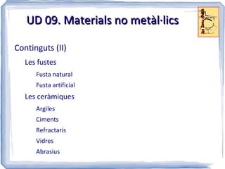 Plàstics o resines:polímers orgànics Cadenes C, H, O i també Cl, F, N o Si Segons el seu origen Naturals: de manera espontània als productes naturals Cel·lulosa, cautxú... Artificials: per modificació dels naturals cel·luloide, viscosa... Sintètiques: síntesi industrial: PVC, PP, PA...