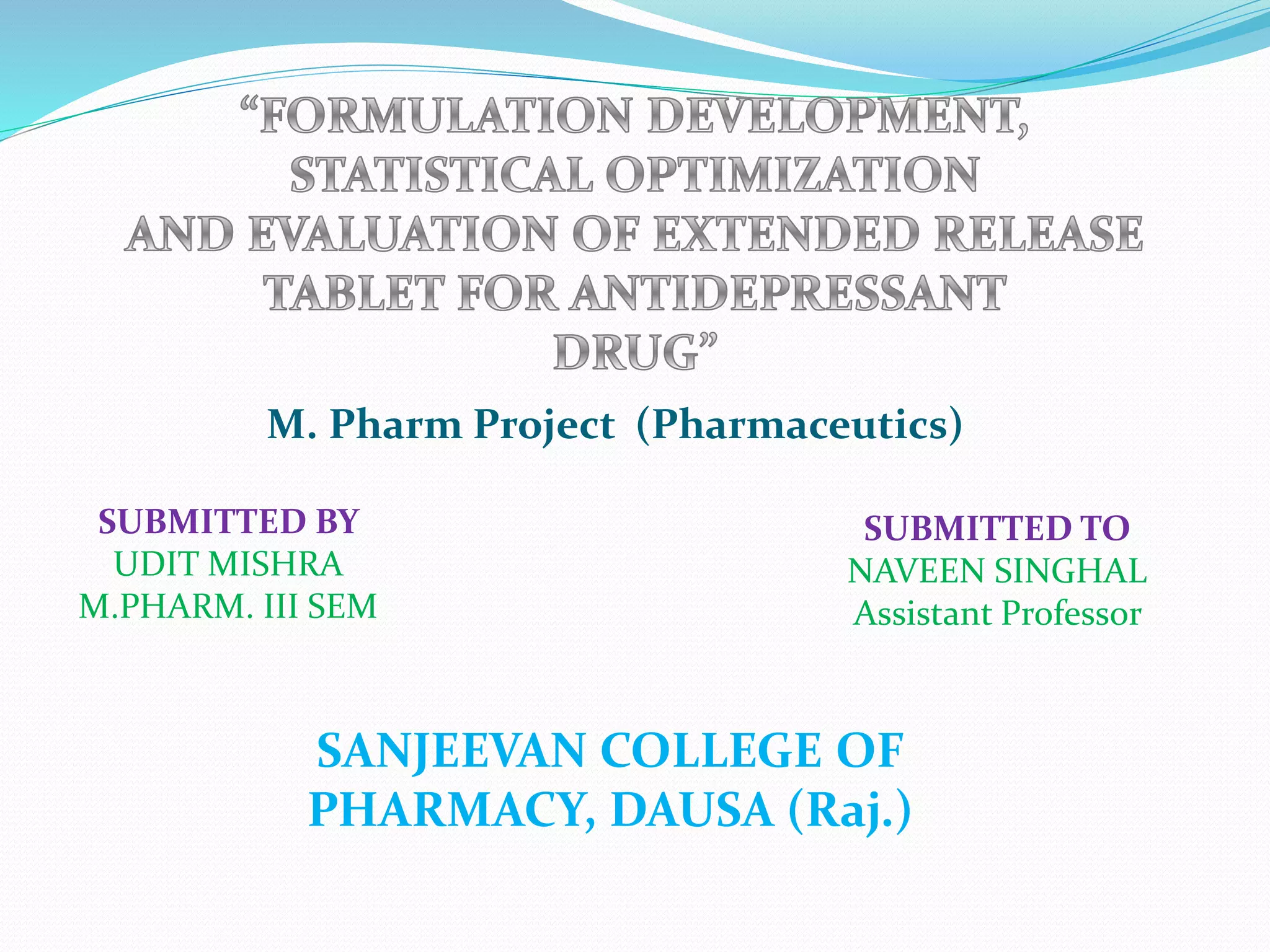 This document discusses developing an extended release tablet for an antidepressant drug using a matrix system. It provides background on extended release drug delivery systems and antidepressant drugs. It then discusses advantages and limitations of extended release systems and matrix systems specifically. The literature review section summarizes several previous studies on developing sustained release formulations using wax or hydrophobic polymers as matrix materials for drugs like tramadol, diclofenac, metformin, and theophylline. The document proposes developing an extended release tablet formulation for an antidepressant drug using a wax or hydrophobic polymer matrix system.