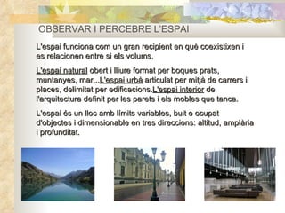 OBSERVAR I PERCEBREL’ESPAI L'espai funciona com un gran recipient en què coexistixen i es relacionen entre si els volums. L'espai natural obert i lliure format per boques prats, muntanyes, mar... L'espai urbà articulat per mitjà de carrers i places, delimitat per edificacions. L'espai interior de l'arquitectura definit per les parets i els mobles que tanca. L'espai és un lloc amb límits variables, buit o ocupat d'objectes i dimensionable en tres direccions: altitud, amplària i profunditat.