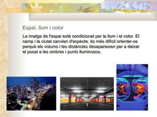 Espai, llum icolor La imatge de l'espai està condicionat per la llum i el color. El camp i la ciutat canvien d'aspecte, és més difícil orientar-se perquè els volums i les distàncies desapareixen per a deixar el posat a les ombres i punts lluminosos.