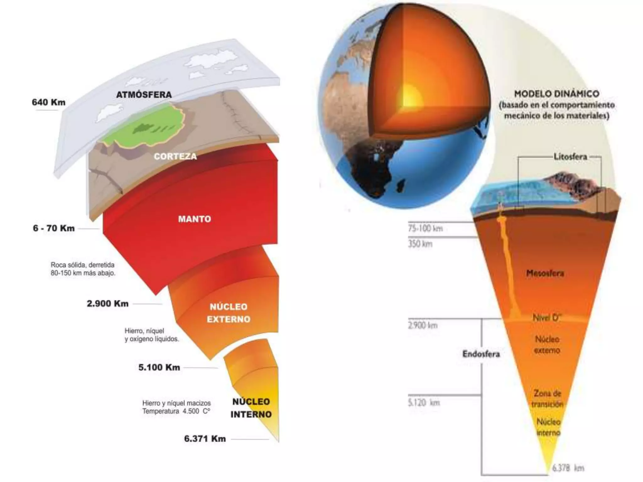 The document discusses the structure and composition of the Earth's interior and surface relief features. It describes the Earth as having a crust, mantle, and core based on its composition. The crust and upper mantle make up the lithosphere which is divided into tectonic plates. Plate tectonics and the actions of external erosional forces shape the Earth's surface relief features such as mountains, plains, and coastal landforms. Volcanic activity, folding, and faulting create different types of mountains during plate collisions and movements.