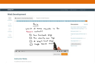 Udacity was founded by Sebastian Thrun in 2011 to provide free online courses focused on computer science. It has since expanded its course catalog, raised over $15 million from investors, and partnered with companies like Google and Nvidia. In 2014, Udacity launched a paid subscription service and an online Master's in Computer Science from Georgia Tech for $6,600. The company has found success by shifting from purely free courses to more vocational training through industry-oriented material and subscription services.