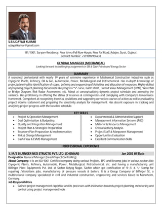 S.B. Udayali Kumar has nearly 19 years of experience in project management roles. He is seeking a senior level position in project management. He has extensive experience in planning, controlling, and monitoring projects to ensure they are completed on time and within budget. He is proficient in using project management tools and preparing project documentation.