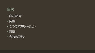 2つのアプリケーション • 特徴 • 今後のプラン