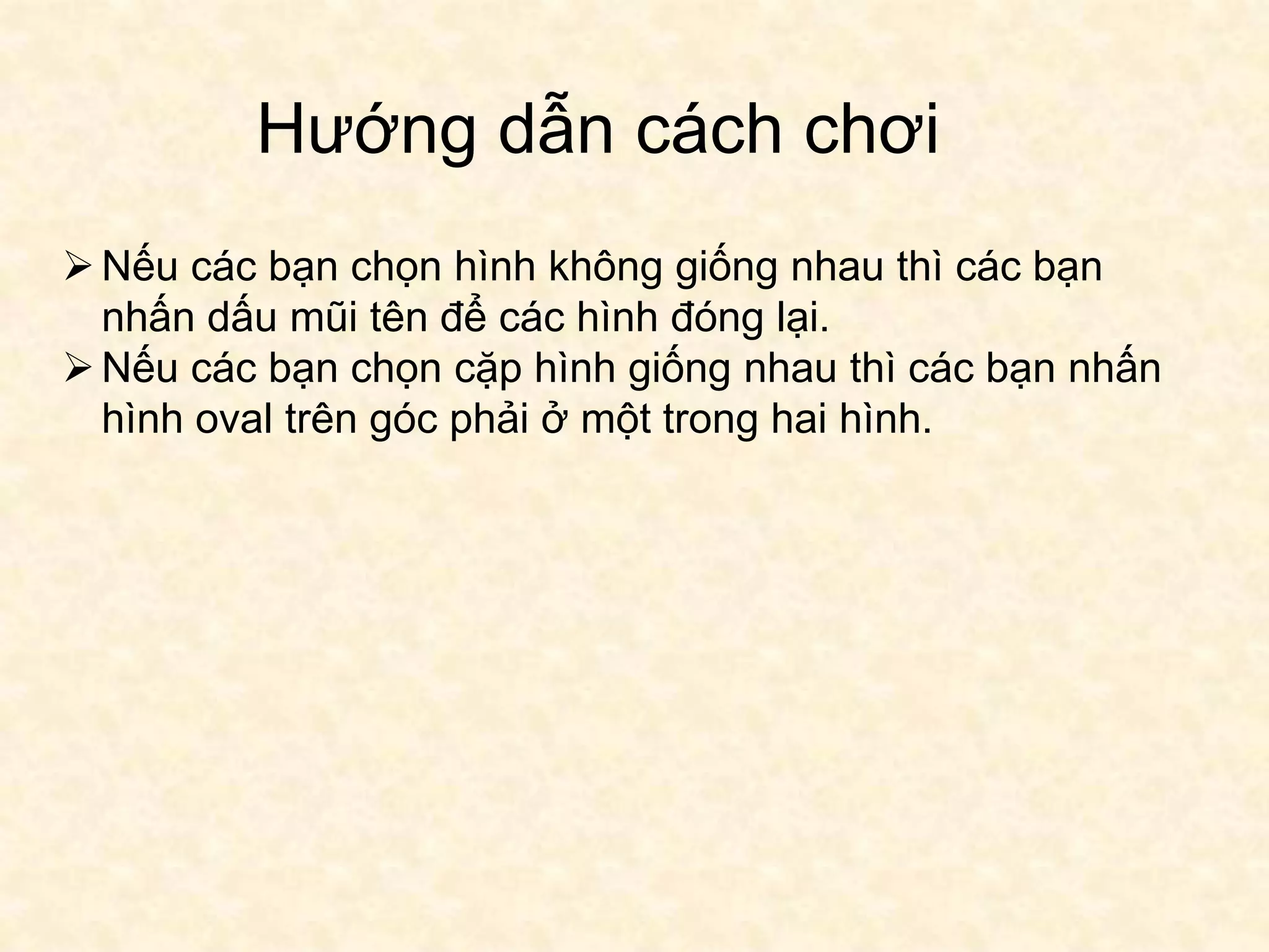 Hướng dẫn cách chơi trò chơi chọn hình, nếu hình không giống nhau thì sử dụng mũi tên để đóng lại. Nếu chọn được cặp hình giống nhau, nhấn vào hình oval ở góc phải để xác nhận. Tài liệu có đề cập đến Trần Tuấn Thánh và số thứ tự các hình.