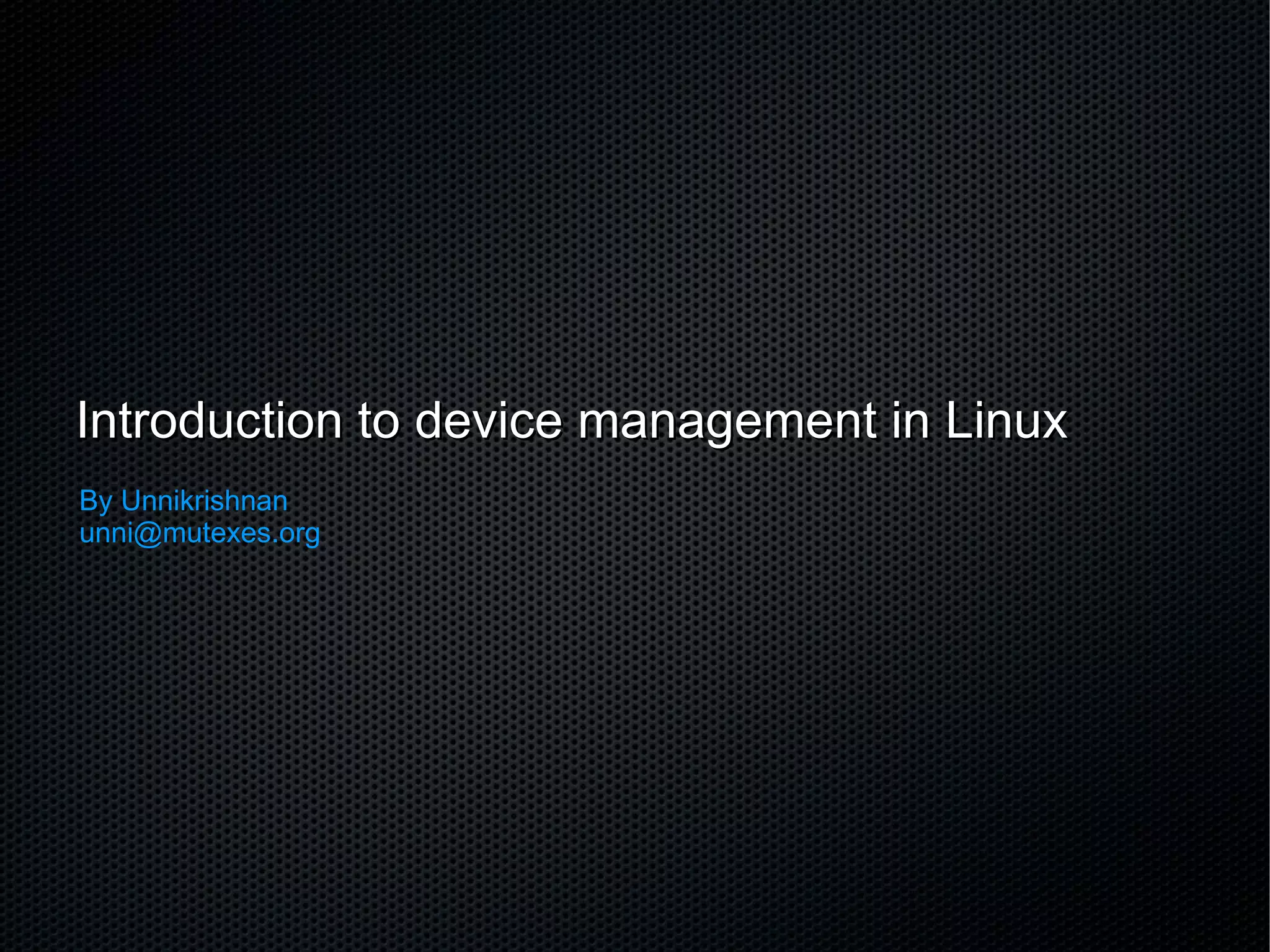 The document discusses how Linux distributions identify hardware devices automatically using tools like Udev, HAL, and D-Bus. Udev detects new devices, creates device nodes, and loads drivers. It shares device information with HAL over D-Bus, and HAL collects this and other data to provide applications with an XML representation of each device's properties. This allows applications like the GNOME volume manager to access and mount storage devices.