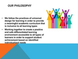 Our school philosophy focuses on universal design for learning to create an inclusive academic environment for all types of learners. Teachers present lessons in multiple ways and allow students various options to demonstrate knowledge. Facilities are fully accessible and classrooms are flexible to accommodate all students. Staff are trained to support students' behavioral, academic, and sensory needs. Assessments are ongoing to determine individualized support and ensure all students can access the general curriculum through differentiated instruction and technologies.
