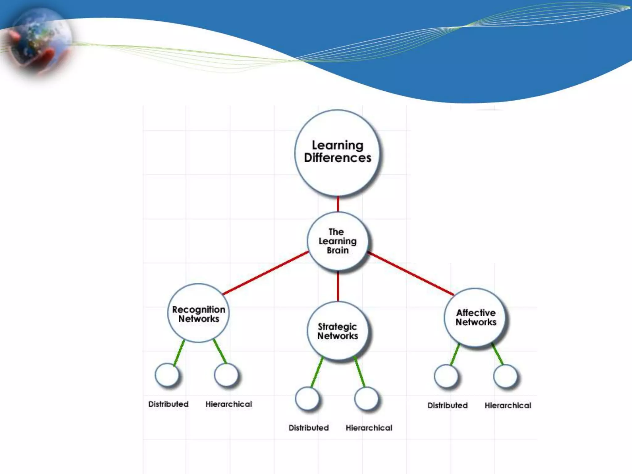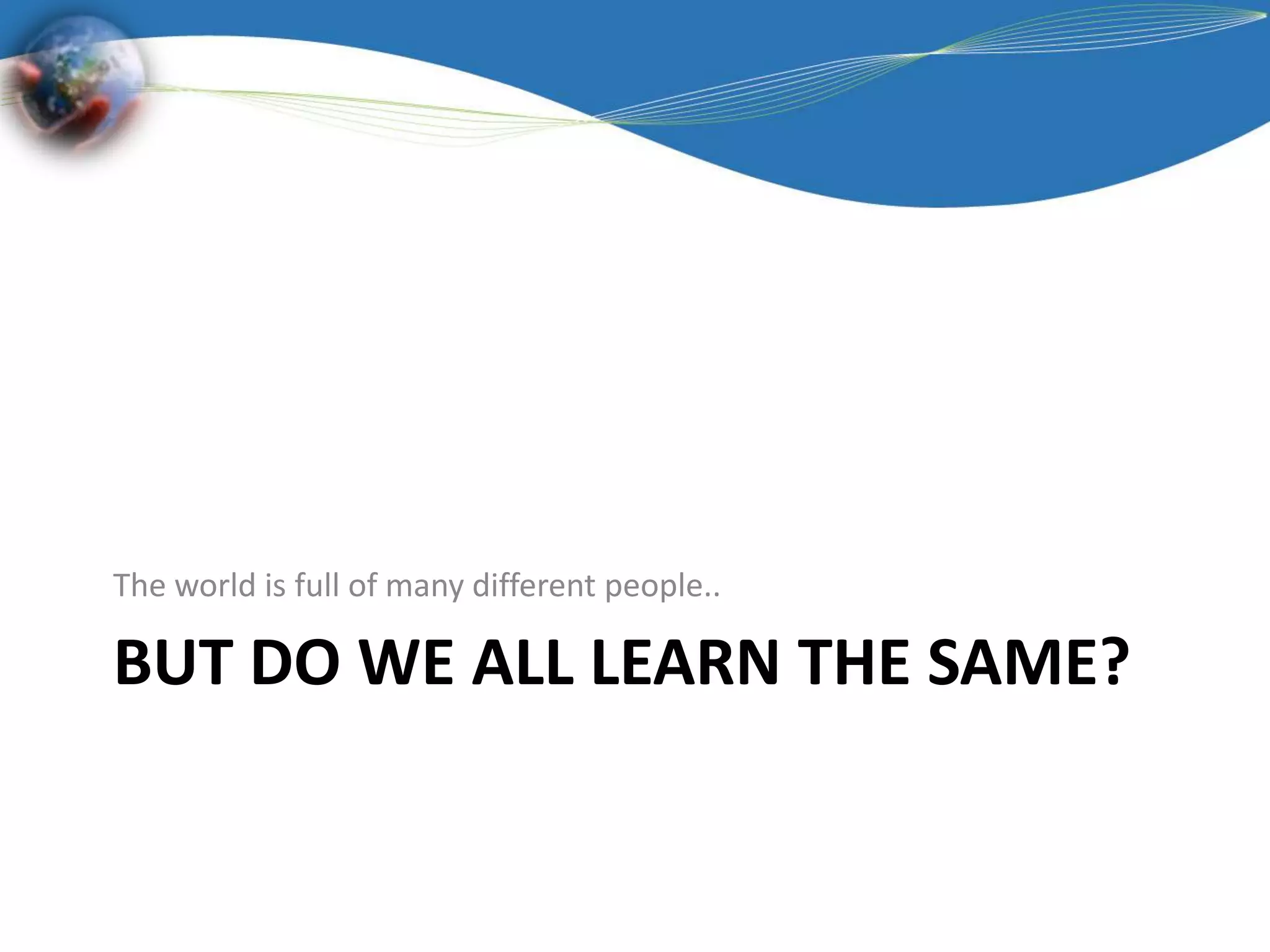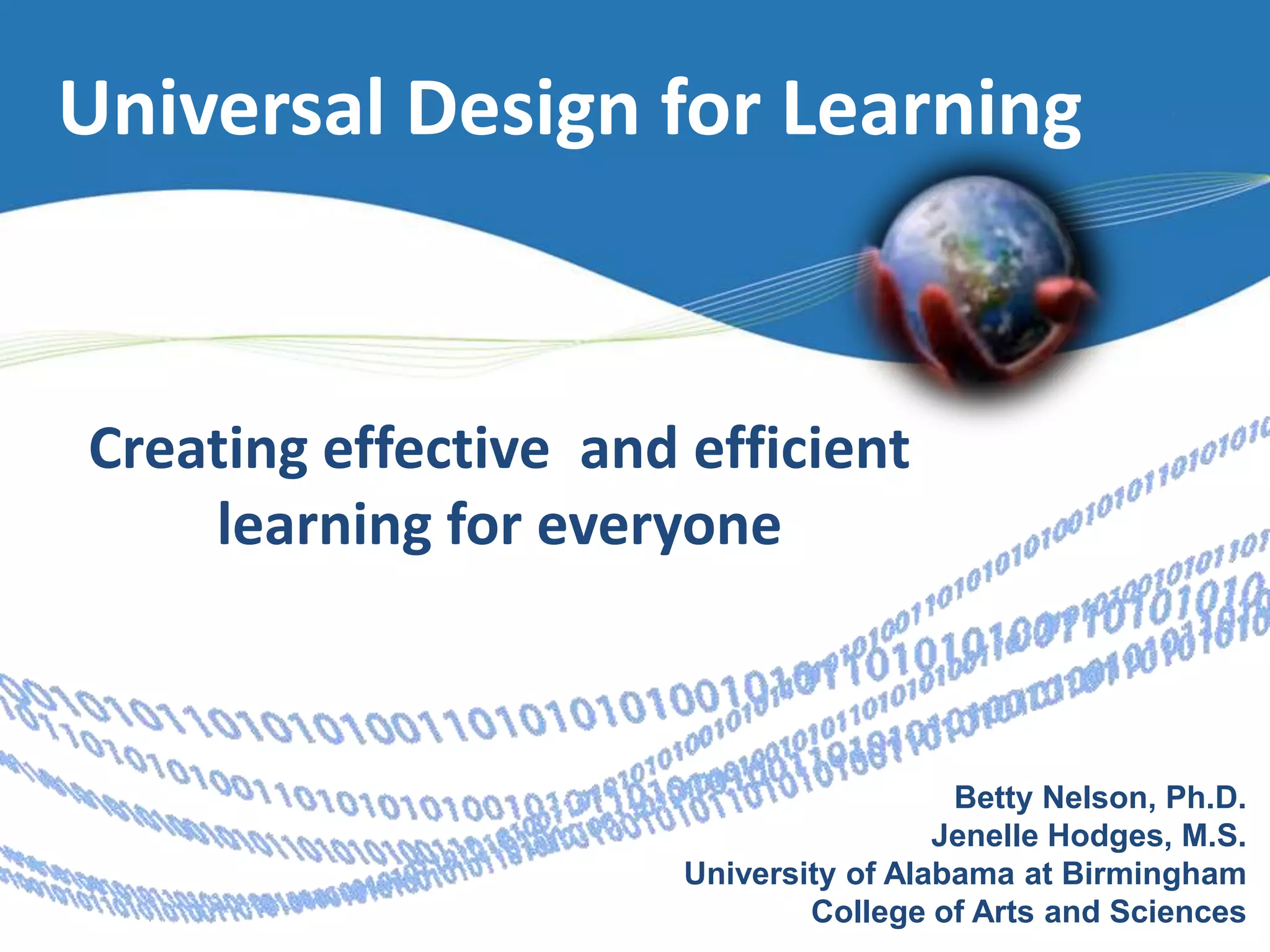 This document discusses Universal Design for Learning (UDL), which aims to create effective and accessible learning for all students. UDL recognizes there are three networks involved in how people learn - recognition, strategic, and affective networks. It also acknowledges people receive and process information differently depending on whether they are visual, auditory, kinesthetic, or multi-sensory learners. UDL calls for providing multiple means of representation, engagement, and expression to accommodate differences in individual learners and learning styles. When designing curriculum, UDL encourages considering ways to present content through different modalities and provide alternative options for students to demonstrate their understanding.