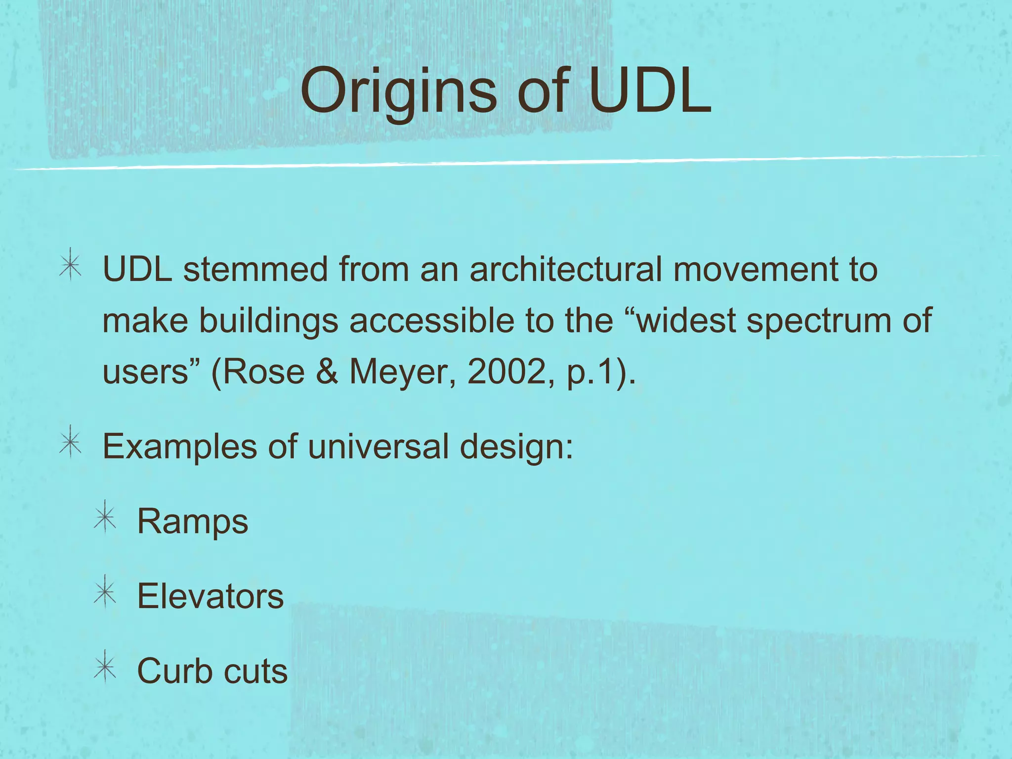 UDL originated from universal design in architecture which aimed to make buildings accessible to all. This concept transferred to education to make learning accessible to diverse learners. CAST developed UDL to provide multiple means of representation, engagement, and action/expression through flexible instruction. While technology is not required for UDL, it can enhance learning when used to provide varied representations, engagement options, and assessments through tools like videos, interactive programs, and individualized feedback. UDL addresses the varied needs of learners as revealed by brain research on recognition, strategic, and affective learning networks.