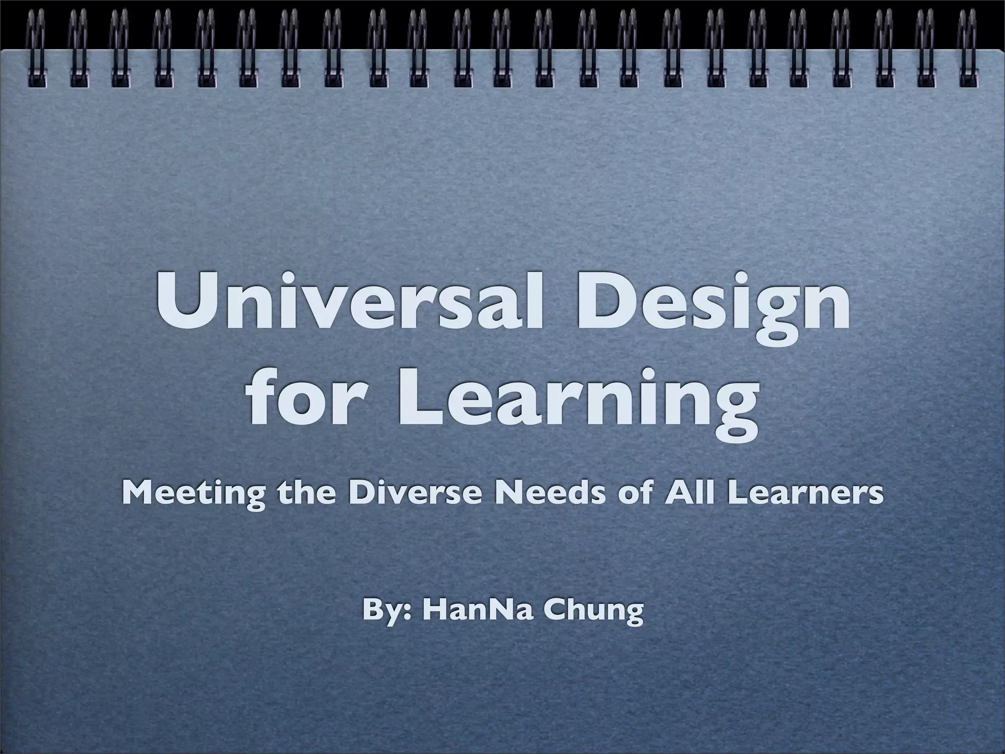 Universal Design for Learning (UDL) is a framework that provides flexibility in how information is presented, how students demonstrate knowledge, and how students are engaged. UDL principles include providing multiple means of representation, expression, and engagement. This flexibility benefits all learners by reducing barriers and maintaining high expectations. UDL is informed by research on how the brain learns and recognizes that there is diversity in how students learn. Technology can support UDL by providing flexible options to present content and for students to demonstrate understanding.